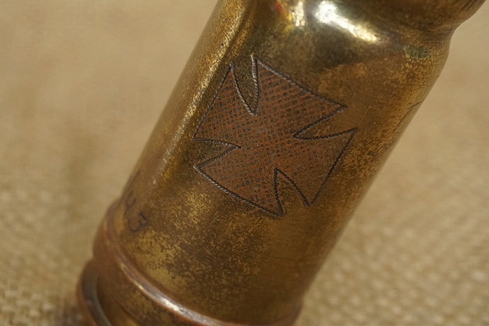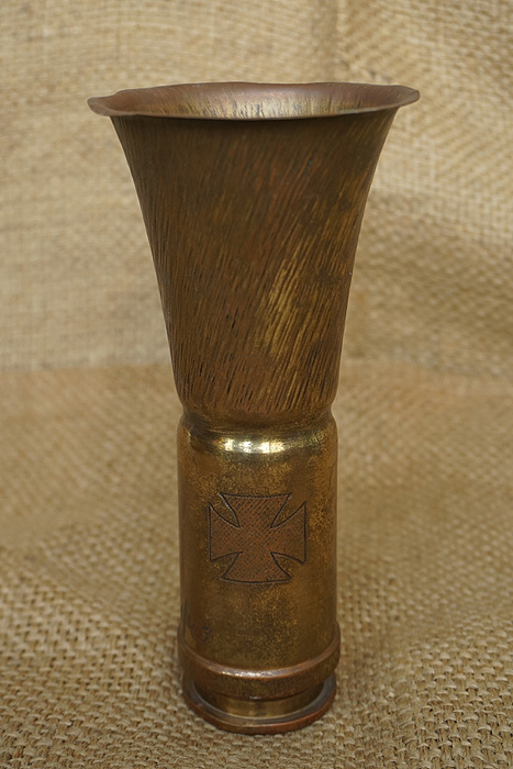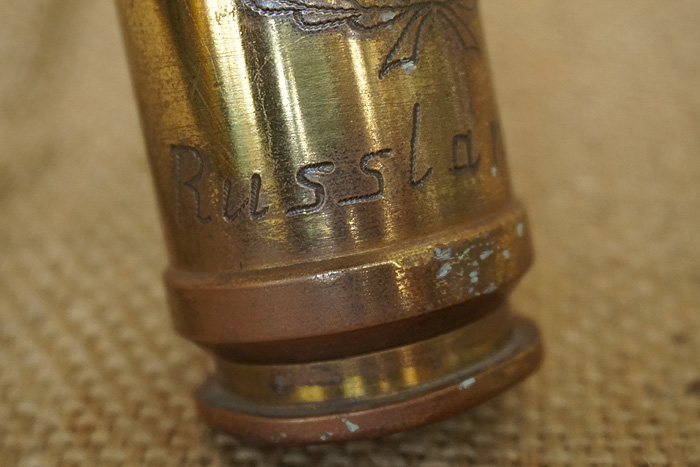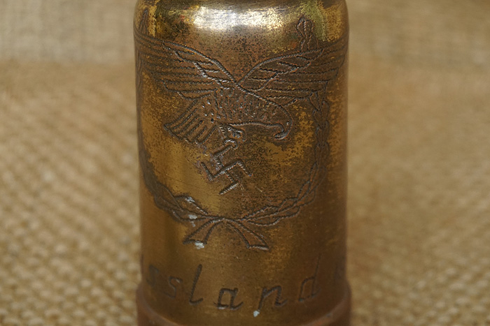 当年德国空军士兵手工雕刻的航炮蛋,瓶身有德文Russland(俄国),及年代41-43(德军进攻苏联最为激烈的三年),瓶底有1937年年份及验证鹰,具体尺寸:瓶口直径8.2CM,瓶底直径5.4CM,高17.5CM