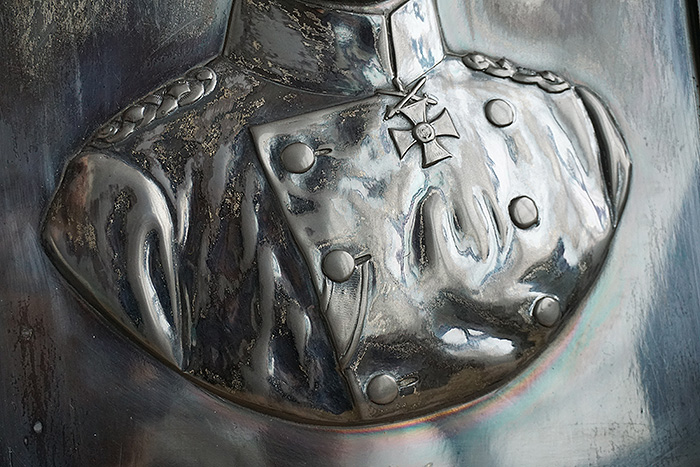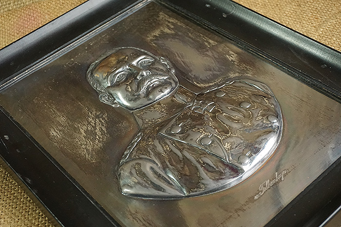 像身由银块铸塑镶木框,高38.5CM,宽30CM,下方有法金汉签名,铸造精致又大气。总重1817.9克(含木框)。