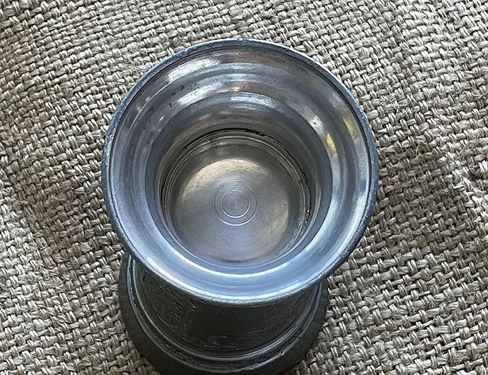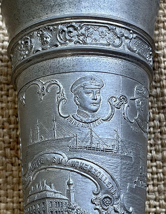 德意志帝国海军花瓶,锌质,高15.5CM,上口直径7CM,底部直径6.7CM,以海军为主题,正面是帝国鹰图案,刻有军舰、海军司令部、德皇威廉二世及两位王子的头像,通体刻花极其精巧。