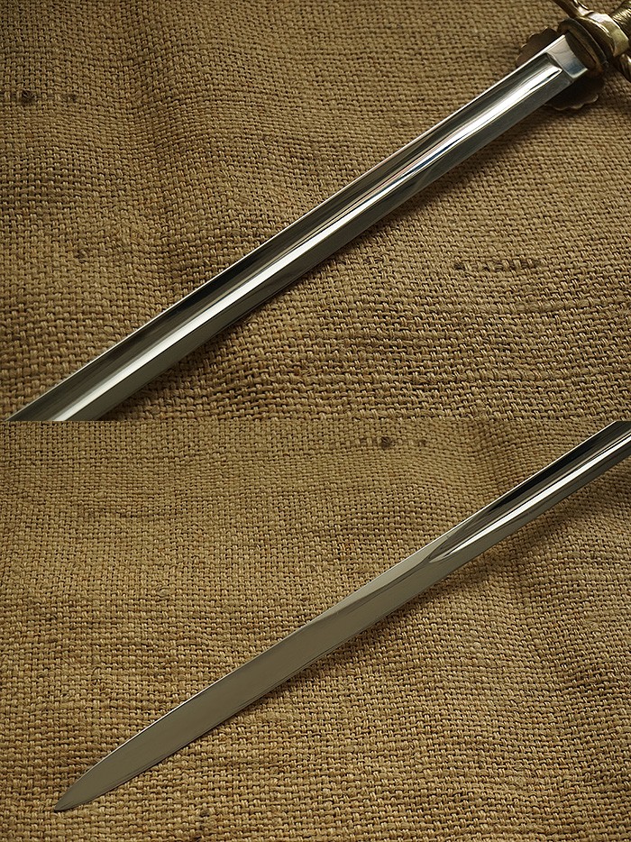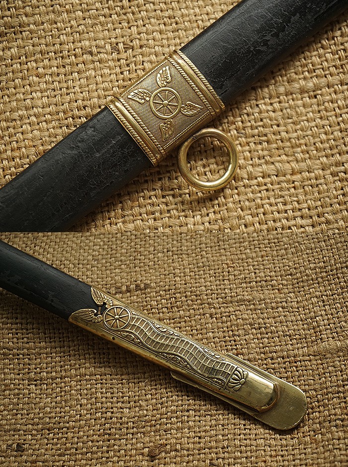 总长92CM,整体用料做工非常讲究。刀身全品相,镀镍层较一般礼仪剑要厚很多(跟国产65骑兵相似)。手柄、护手及剑身上的装饰全部是黄铜材质。其中护手装饰带“双翼飞轮”标志,代表铁路为帝国提速,柄末地球仪设计,铁路线分布球体,代表帝国铁路线未来将横跨贯穿世界各大洲。刀鞘上的构件装饰图案都是带轨道的“飞轮”标志,鞘身由皮革包裹铁鞘,手感非常沉重。德国在1871年统一后,法国割让领土阿尔萨斯-洛林地区给德国,帝国铁路总局随即在该地区成立,德国第一条铁路线随即产生。