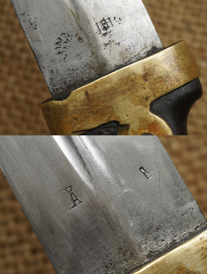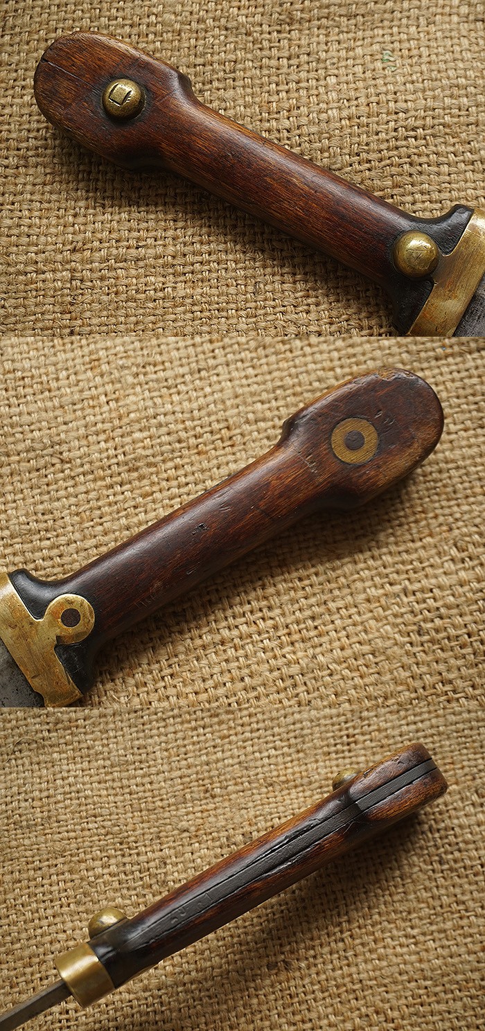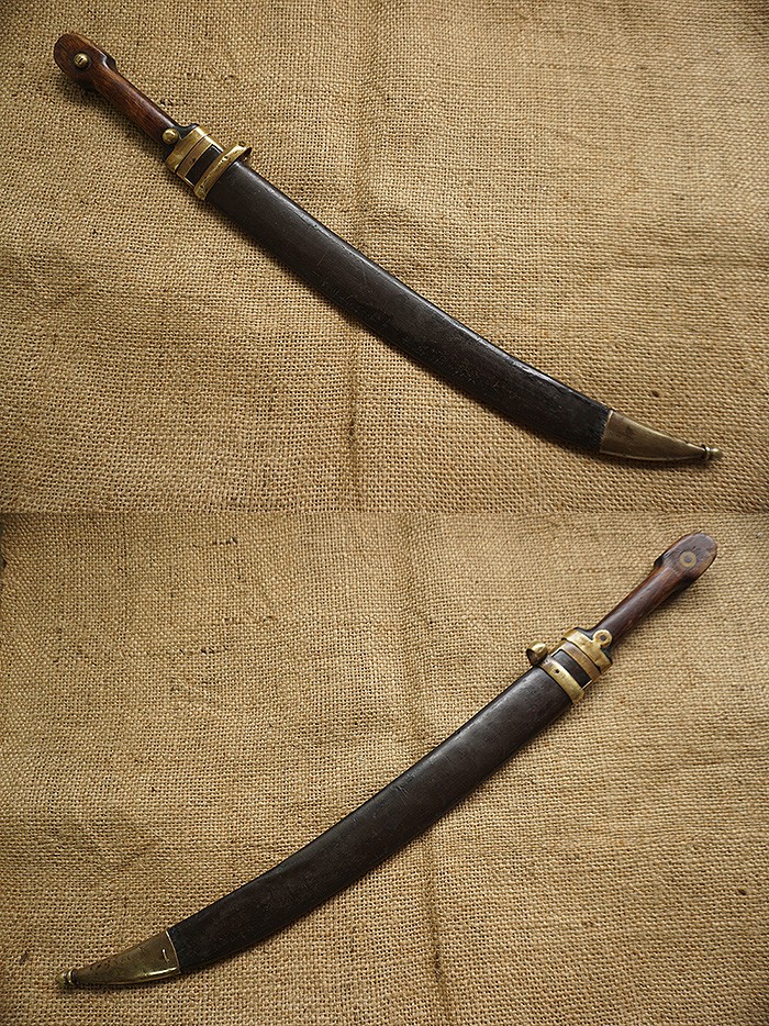 总长约64CM,皮革包裹木鞘,两端铜构件。刀身洁净,靠近厂标位置轻微锈污。