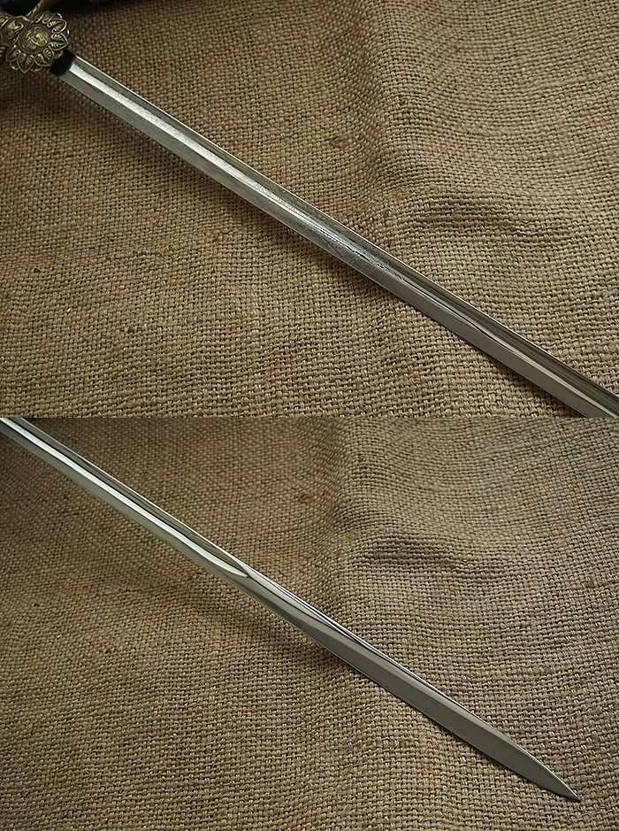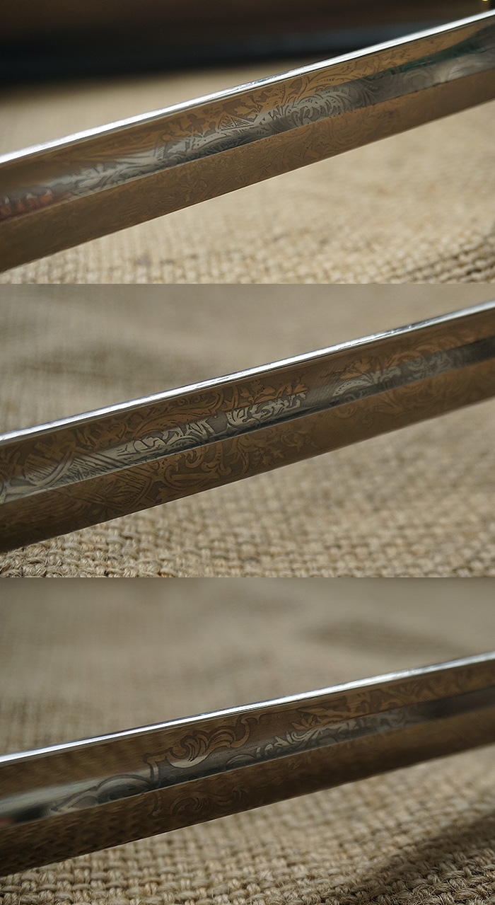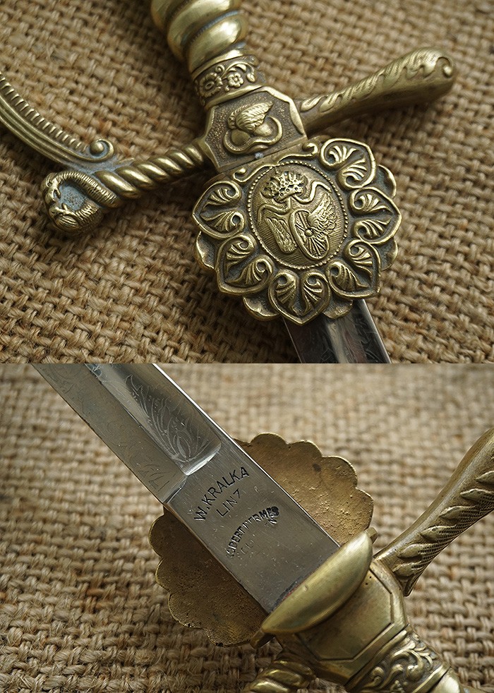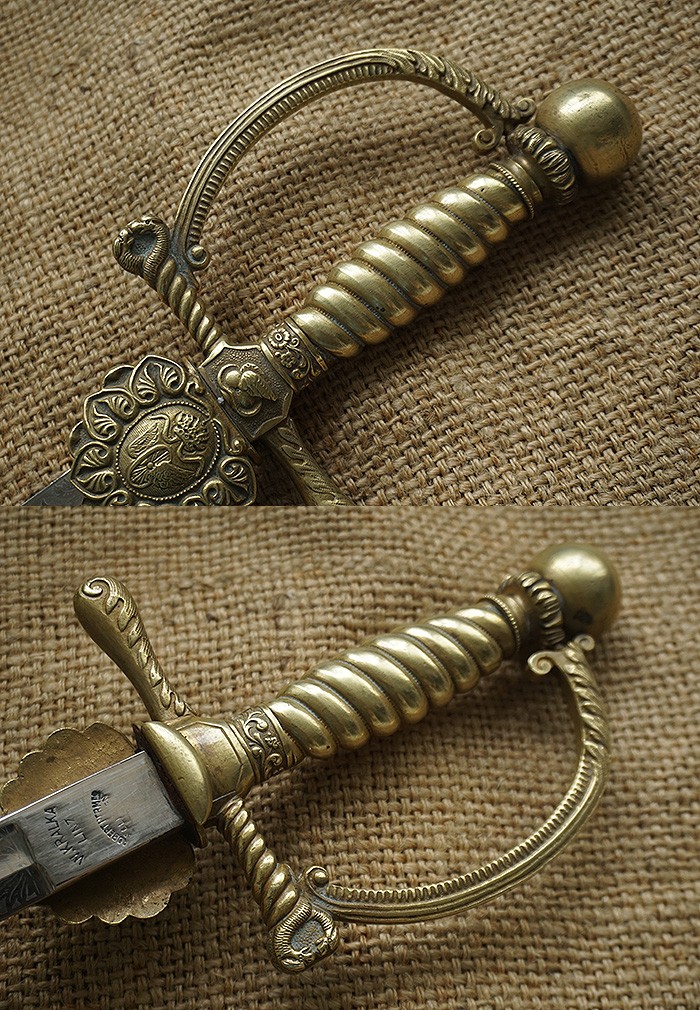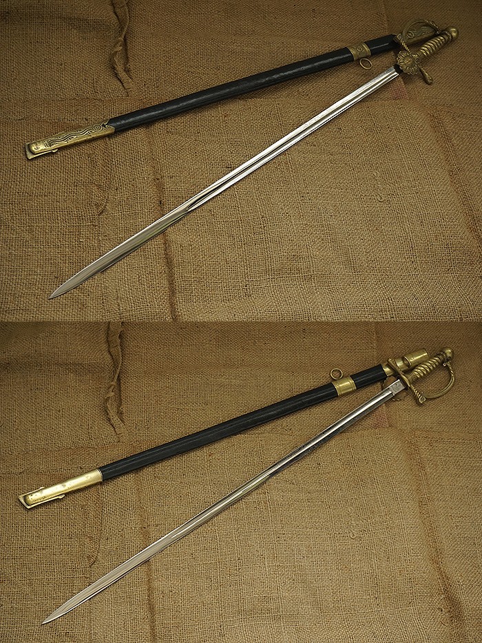 总长98CM,全品相刀身带刻花,手柄、护手及剑身上的装饰全部是黄铜材质。其中护手装饰带“双翼飞轮”标志,代表铁路为帝国提速,柄末圆形设计代表地球仪,寓意帝国铁路线未来将横跨贯穿世界各大洲。刀鞘上的构件装饰图案都是带轨道的“飞轮”标志,鞘身由皮革包裹铁鞘,末端黄铜构件少许磕碰,整体手感非常沉重。