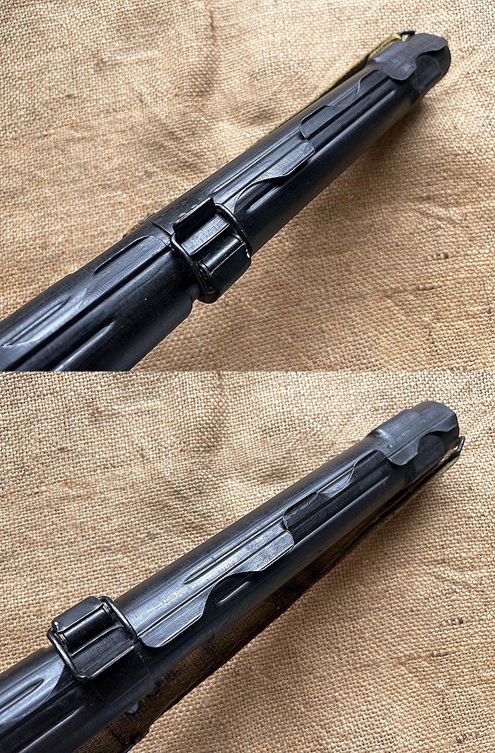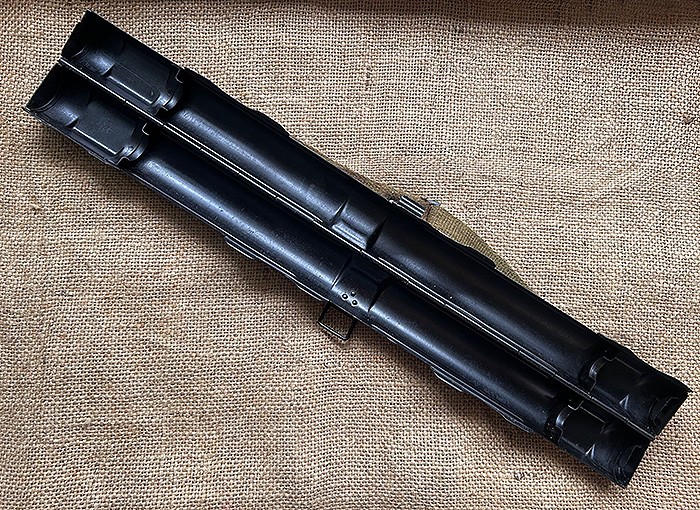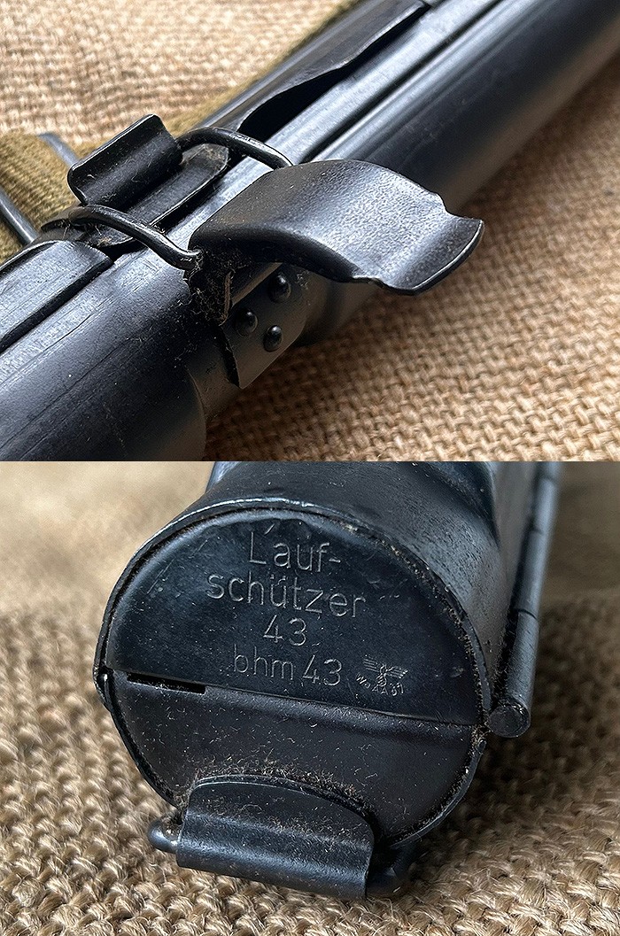 1943年老库存,没有使用过,属于当年盟军从仓库缴获的战利品。尺寸:长65CM,直径5CM,中间开合,整体呈圆柱形设计,通体烤蓝防锈工艺,侧面保留原厂帆布挂带,底部带厂标、年份及纳粹验证鹰标。
