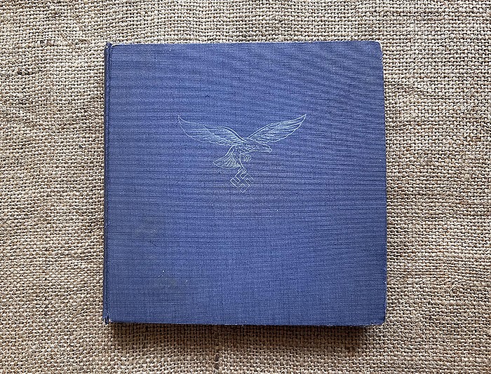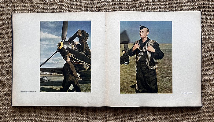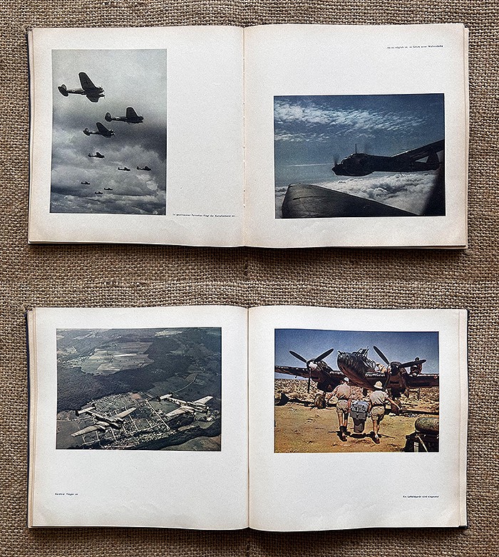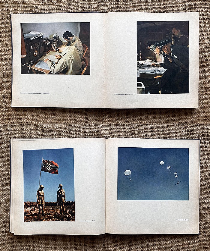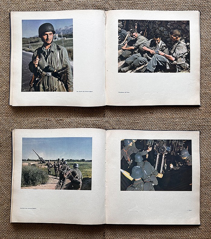 尺寸:24X24CM,1942年发行,麻布质硬抄封面,侧面有德文:Fliegende Front(即:飞行前线),共120页,内容涵盖北非战场、东线战场、西线战场、援助海军、高炮部队、空降部队等,共108张相片,全部罕见地采用彩色印刷,难得一遇的战场实况图鉴。