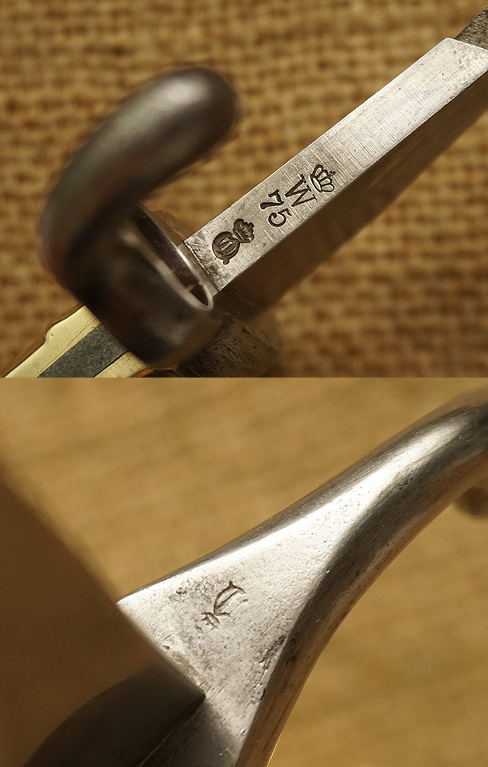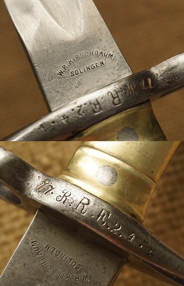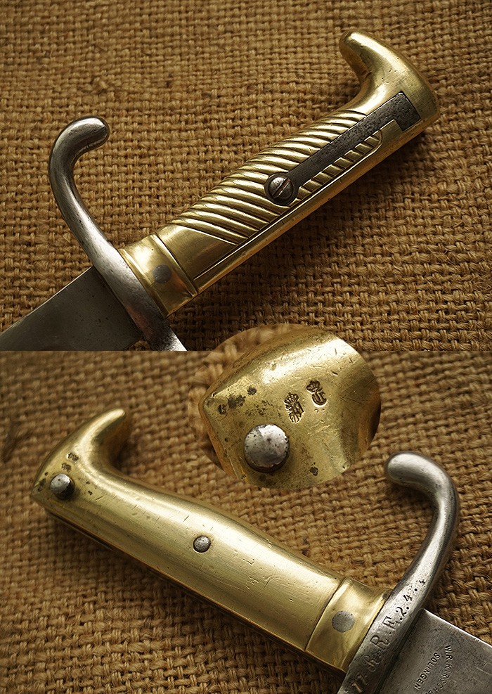近年来难得再找到这种品相的1871。刀鞘皮革保存完好,前后端黄铜构件均带有德皇验证标,前端构件轻微磕碰。刀身基本全品相,轻微锈污。刀脊带75字样,代表1875年,护手与手柄同样均有德皇验证标。