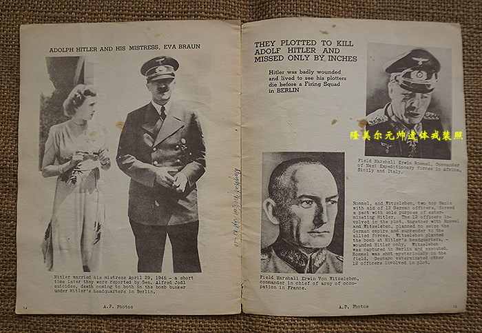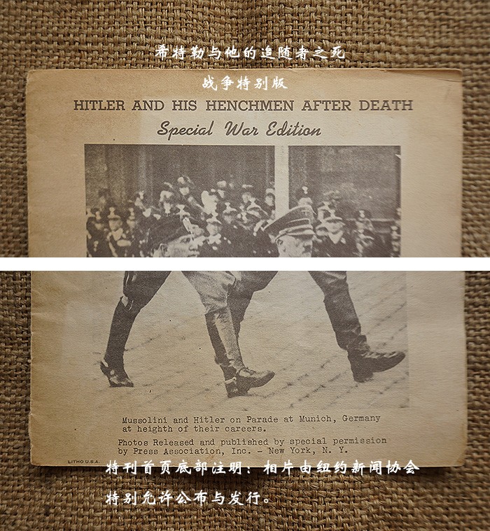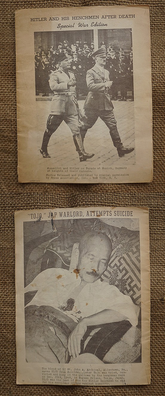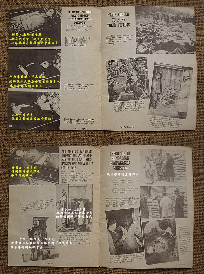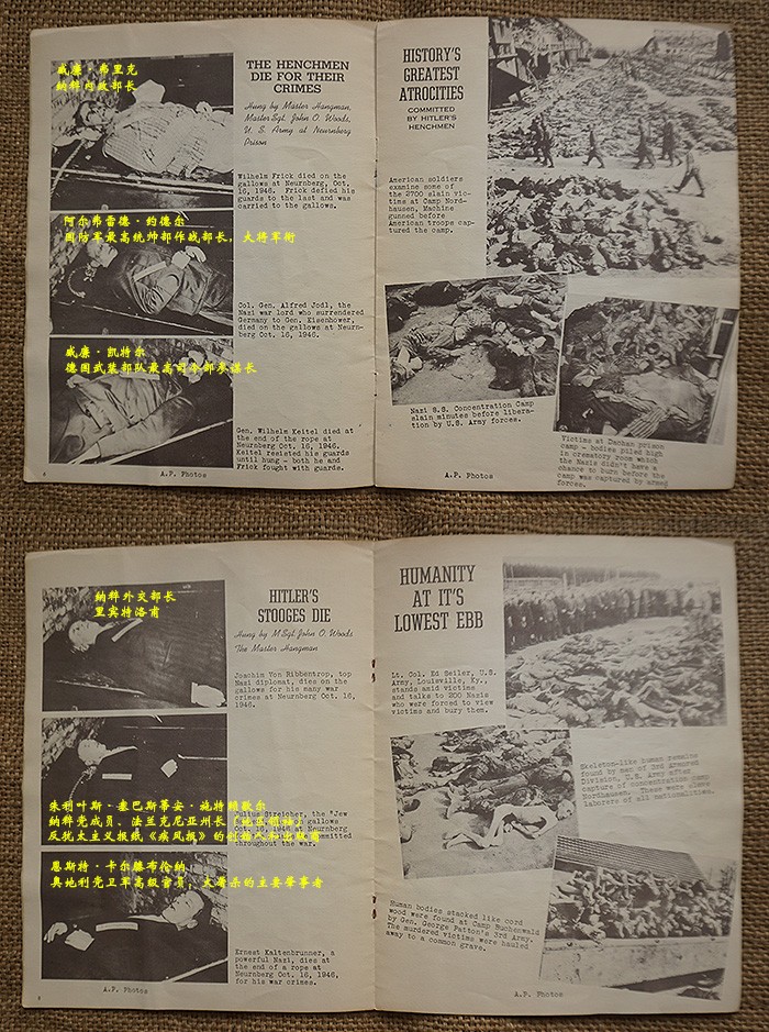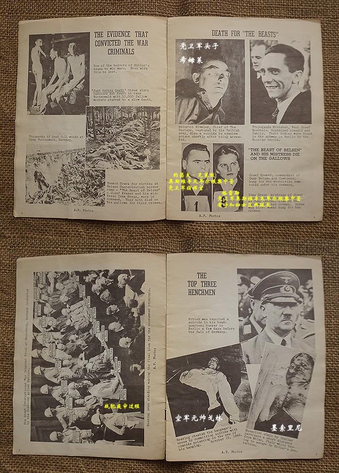 一共16页,尺寸:21X28CM,特刊是德国纽仑堡审判完结并对战犯实施死刑后发行的,内容图片均来自美联社,包括党卫军领袖希姆莱自杀后的官方照,党卫军奥斯维辛集中营指挥官约瑟夫·克莱默绞刑照、空军元帅戈林自杀照、外交部长里宾特洛甫绞刑照、国防军凯特尔元帅绞刑照、内政部长威廉·弗里克绞刑照、国防军作战部长阿尔弗雷德·约德尔大将绞刑照及受占地区领导人受刑照等等,并附上了他们所犯下暴行的证据图片,倒数第二页有一张首次公开的沙漠之狐隆美尔元帅自杀后遗体的戎装照,末页补充了一张东条英机的自杀照等等。当代已知的个别战犯图片均来自该特刊,也有些图片是之前未曾看到过的,该特刊存世量不会很多,国内仅见这本。
