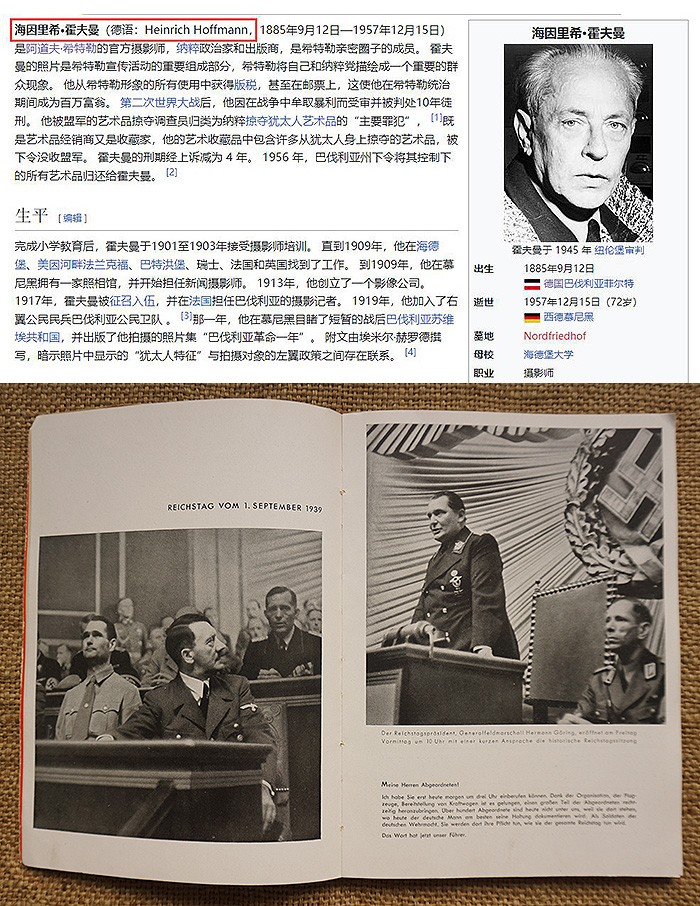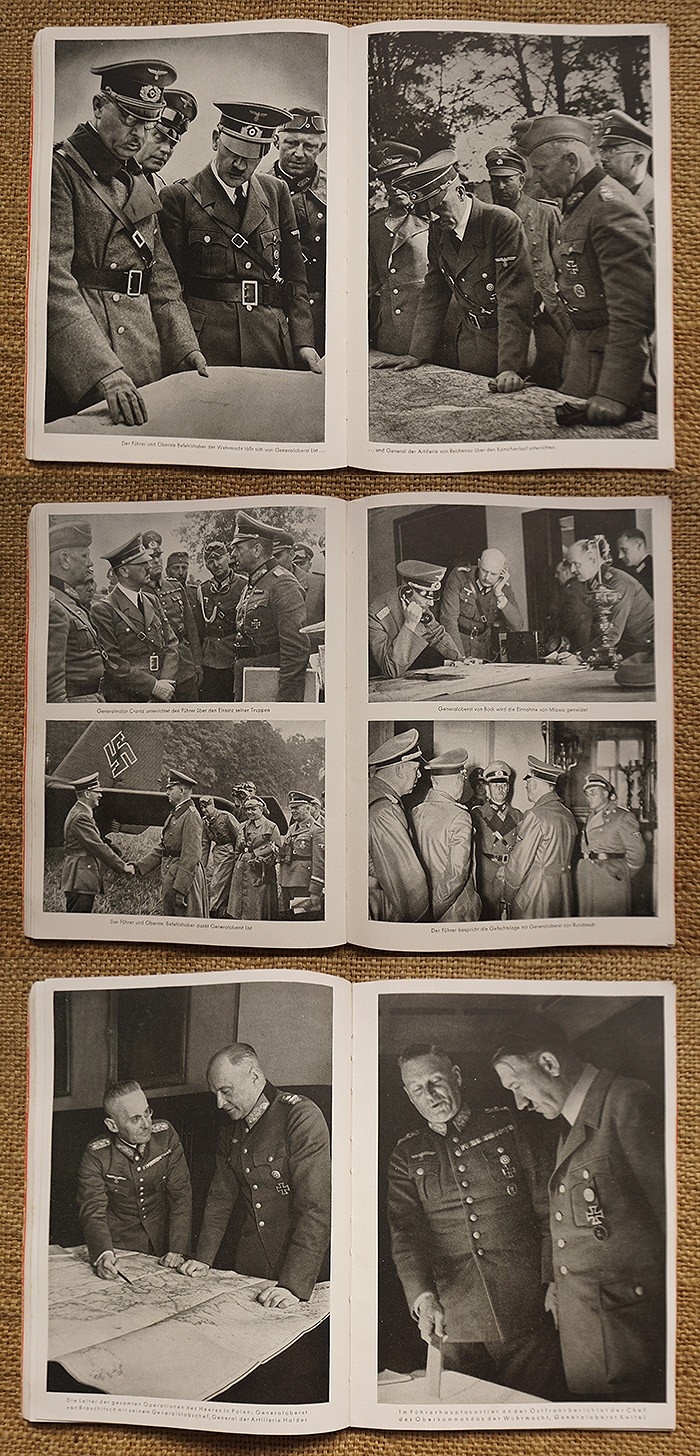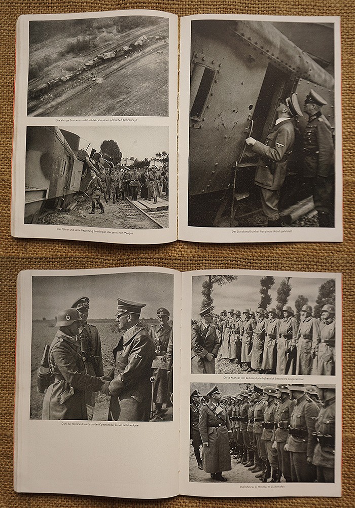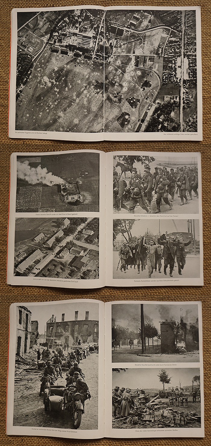 尺寸:19.5X26.3厘米,全书100张黑白照片,92页。图片内容论述了德国在入侵波兰前会议商讨计划并最终由元首签名下达入侵命令于1939年9月1日凌晨四点四十分正式行动,空军率先发起猛烈攻击,陆军势如破竹深入波兰腹地,元首亲赴前线指挥所听取战况汇报等等珍贵画面都被霍夫曼及时记录下来。