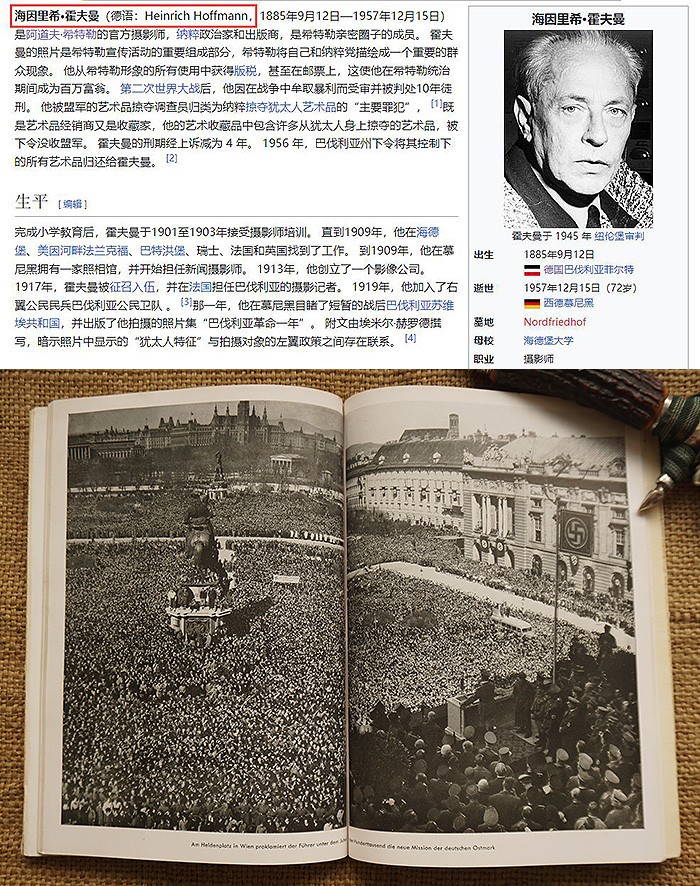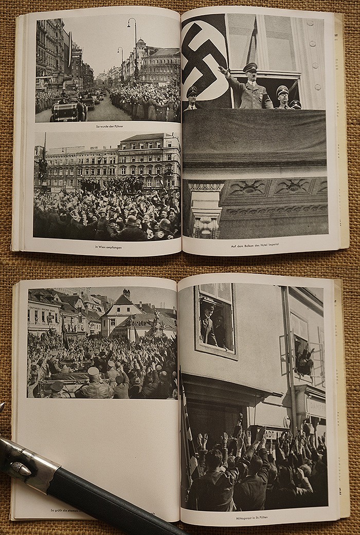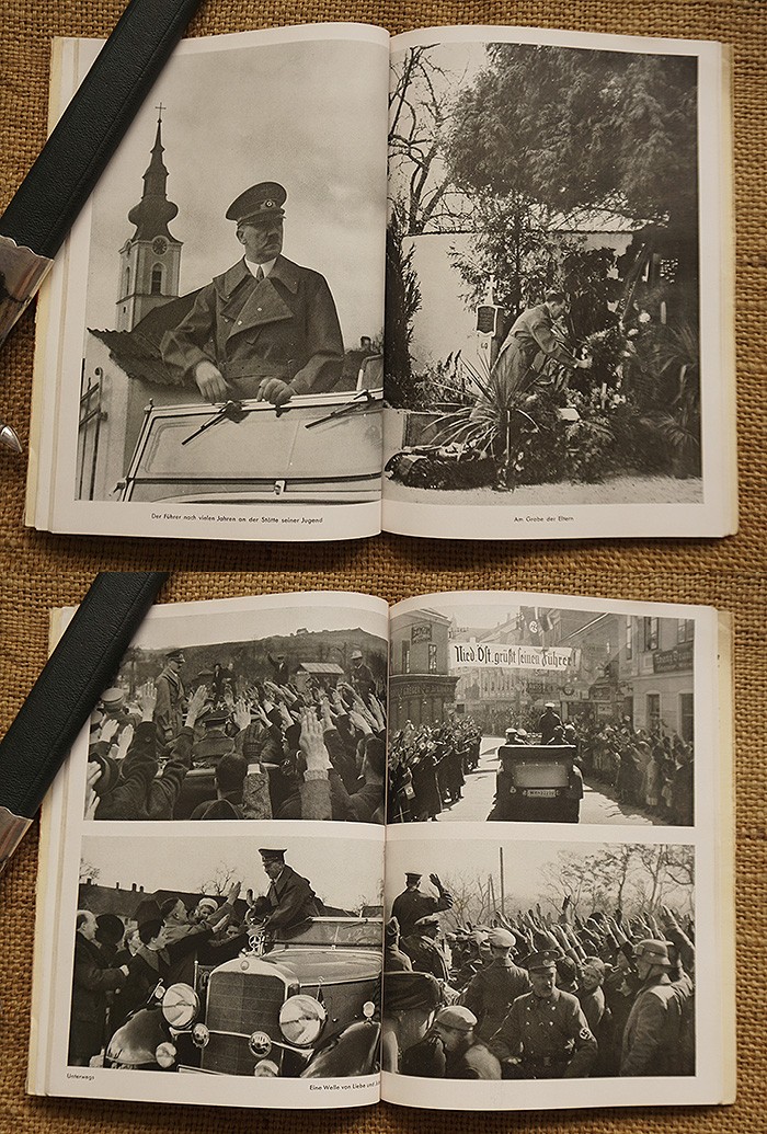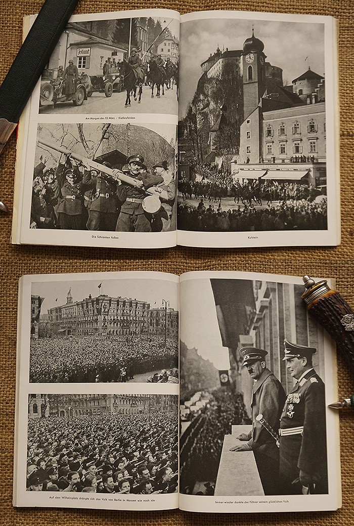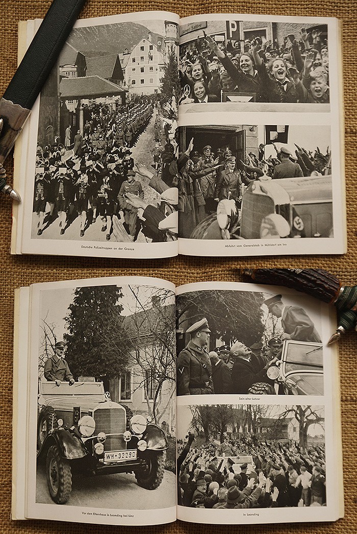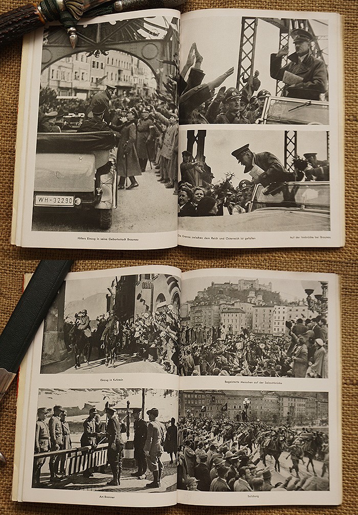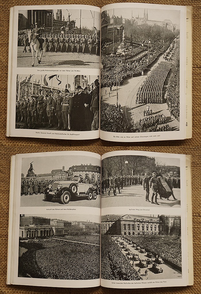 尺寸:19.3X26.5CM,全书78张黑白照片,62页。图片内容讲述了1938年3月13日德国与奥地利合的重要历史事件,霍夫曼从不同的角度去包装宣传元首在奥地利人民心目中的“神圣地位”和受到狂热追捧,从主动开启边界护栏迎接德军,到万人空巷夹道欢迎元首车队,再到3月15日20万人聚集在维也纳的英雄广场聆听元首宣布德奥合并,每一张相片都代表着元首的高光时刻。