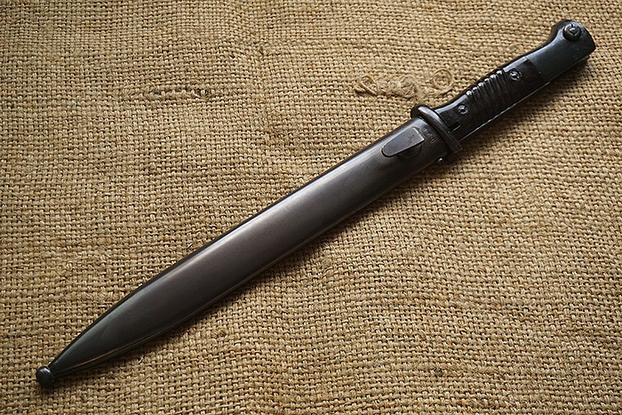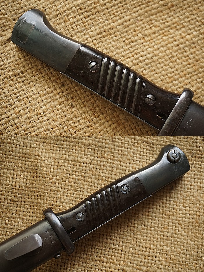 罕见的烤蓝泛红版本,俗称“烤红”。刀身烤蓝保存度90%,柄末卡榫位置轻微锈蚀,不影响整体品相。刀鞘烤蓝保存基本完整,少许浮锈。