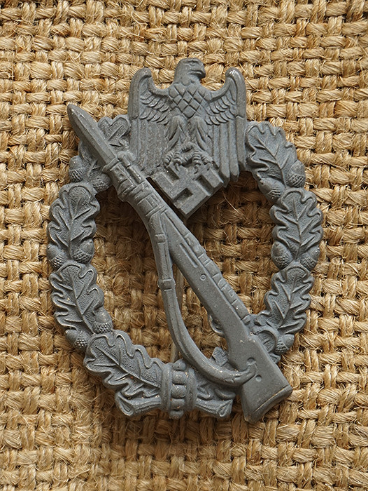 锌合金材质,库存品相没有使用过。授予参加过三次步兵突击战或反击战、侦察行动步兵人员。