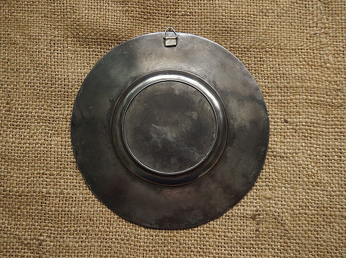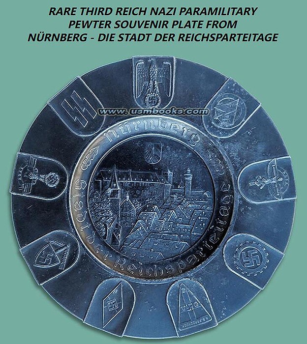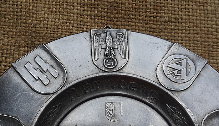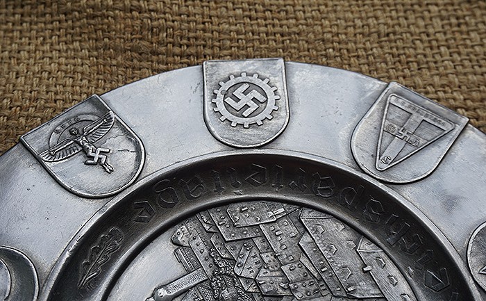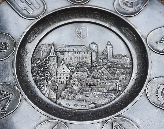 锡质,直径20CM,中间主体图案是纽伦堡城市风景,各准军事部门徽标环绕一圈,整体包浆柔润无破损。