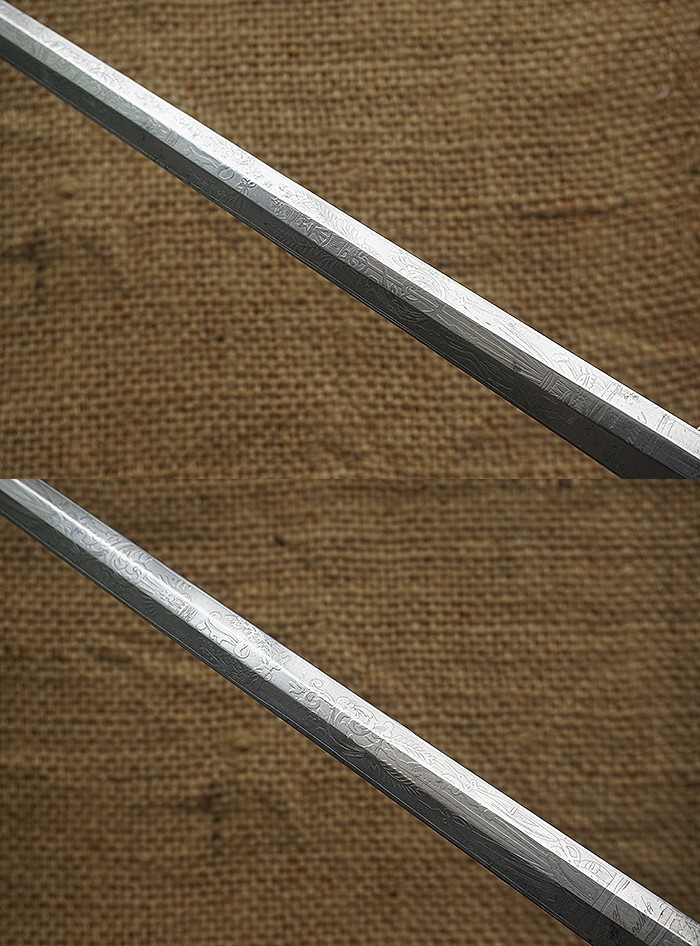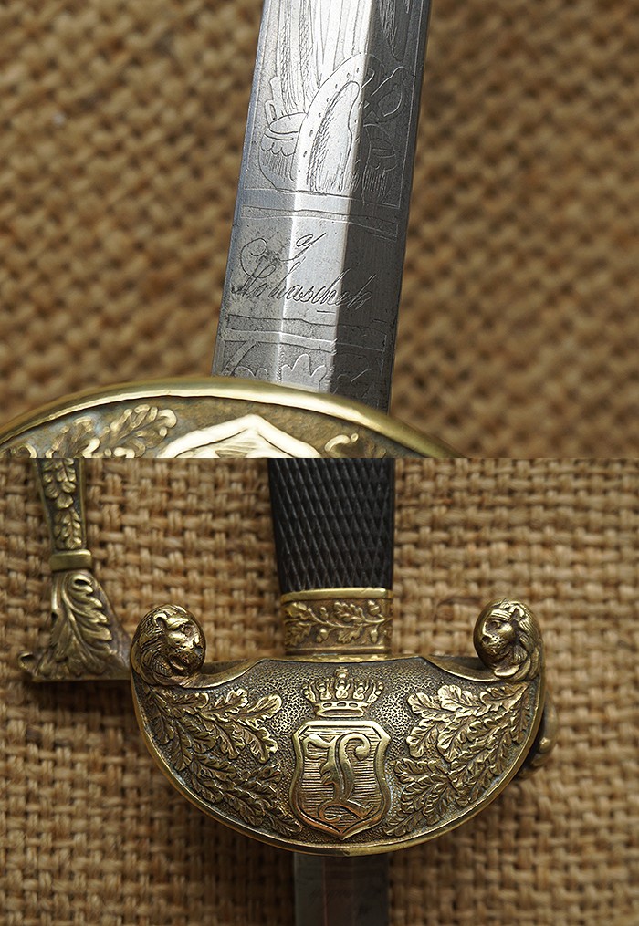 总长90CM,牛皮鞘,两端黄铜构件轻微小磕。护手正面德国皇冠图案,两侧灈狮头装饰,刻花刀身轻微锈污,整体接近全品相。