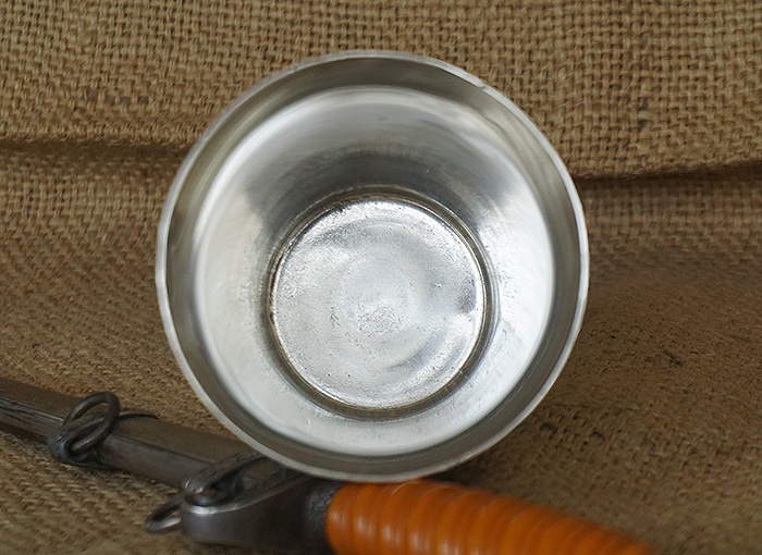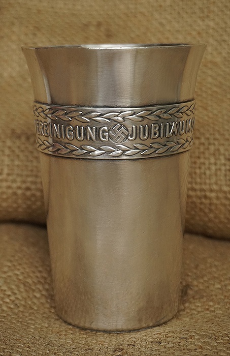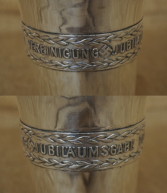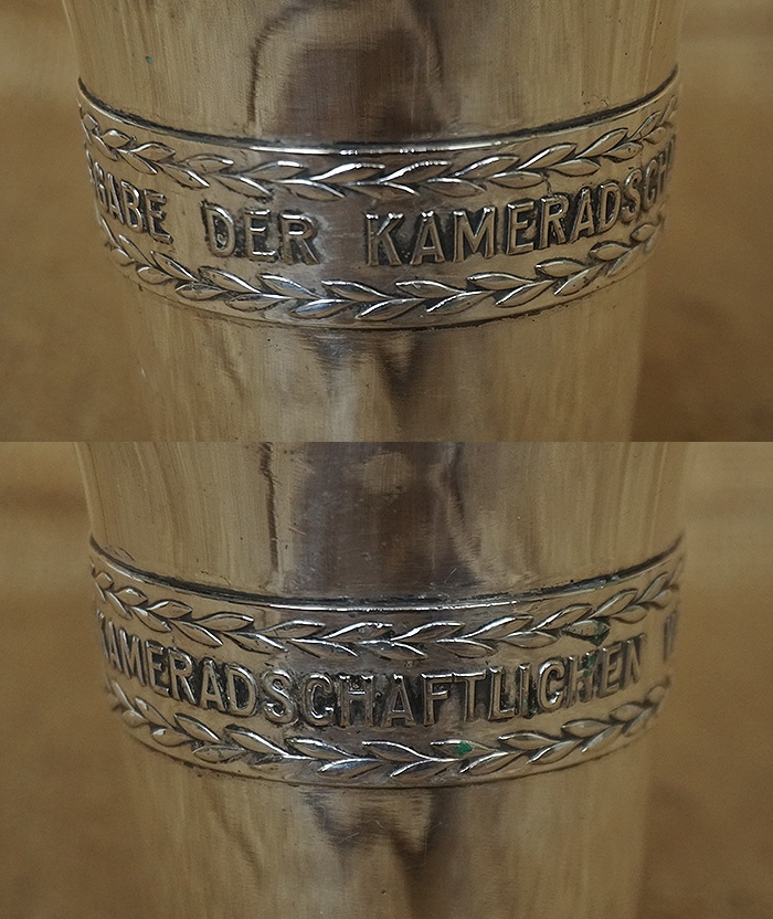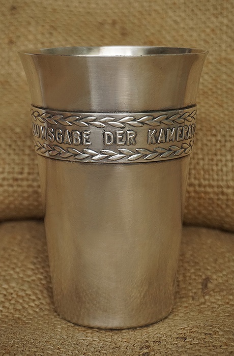 镍银合金材质,直径9CM,高约13CM,重量366.7克,正中位置德国万字,环绕杯身的德文“JUBILÄUMSGABE DER KAMERADSCHAFTLICHEN VEREINIGUNG”,即:战友联合会的纪念杯。杯身保存非常洁净,表面没有磕碰,稍作清洗还能使用。