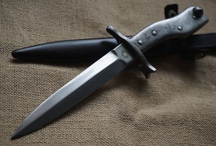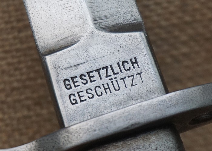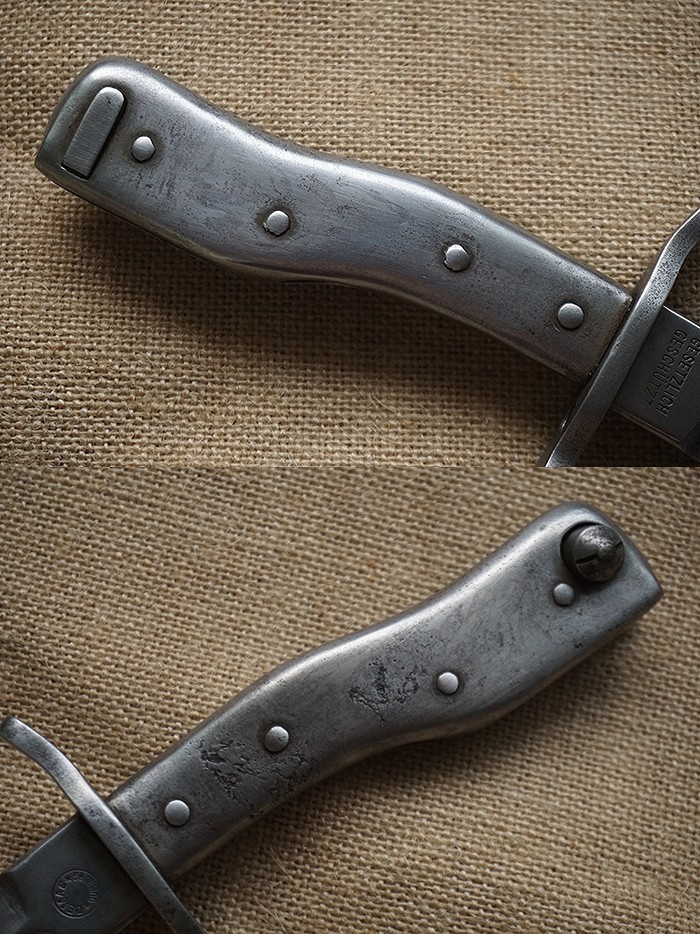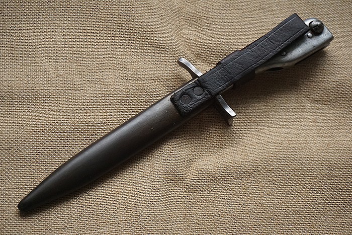极其稀罕收藏品种,总长28CM,兼具近身防卫格斗与上木仓冲锋两用功能。一战中后期在军用原材料日益紧缺的情况下发行。该刀整体全品相,刀身轻微使用状态,刀鞘烤蓝完整,刀鞘上的皮绑带保存完美。