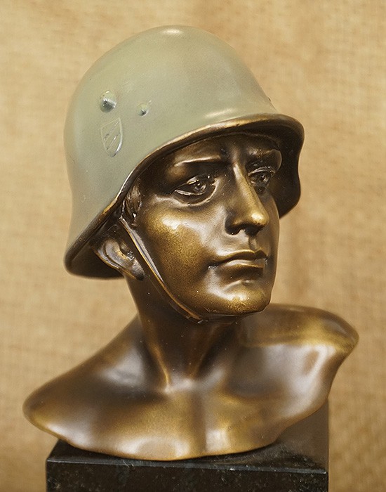 总高18CM,像身铜质,头盔苹果绿烤漆保存完整,两侧国防军盔徽清晰。大理石底座,正面镶国防军鹰,整体外观庄严品相完美,铸造细节极其到位!