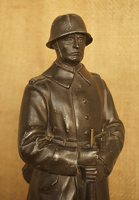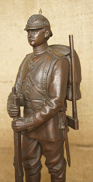 极其少见,高约28厘米,全铜打造,重达1735克,脚部位置带柏林厂标。整体全品相,细节极尽丰满,腰间1871刺,肩章军衔,头盔正面的帝国鹰都完美铸造出来,唯一美中不足的是头盔顶尖少许歪偏。