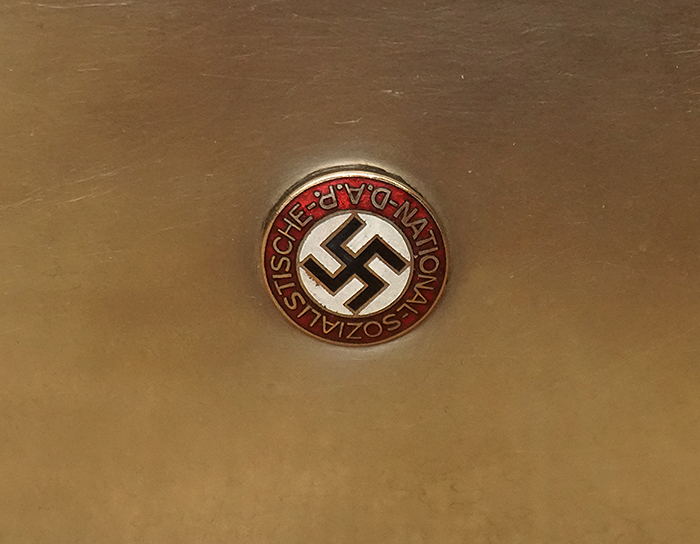 尺寸:9.2x20厘米,厚3厘米,白铜镀银材质,正面镶嵌党徽,内分两个间隔,适合摆放现在香烟。