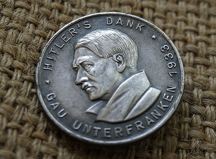 铜质,直径7.5CM,厚0.6CM,重157.6克, 正面士兵侧面像,头盔上现清晰的纳粹鹰,围绕士兵像德文:Kradschutzenbataillon 64 14. Panzer Div. 即第 14 装甲师第 64 摩托化兵营。背面主体图案是大德意志十字勋章,环章体德文:SAMARA CHARKOW NOWOTSCHERKASK STALINGRAD,即该装甲师曾经参与过战役
