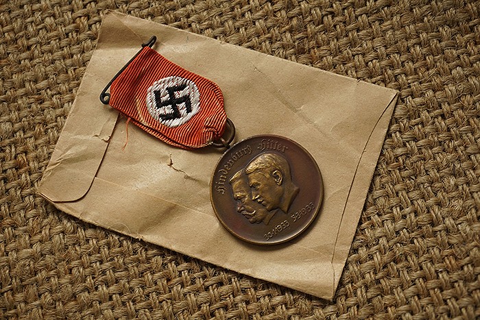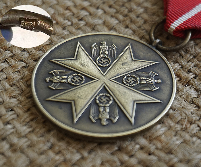 当年由纳粹政府颁发的一项外交荣誉奖,主要授予对象是为德国作出杰出贡献的外国人,特别是外交人员。该章铜质,挂环上标记30,即由奥地利维也纳厂生产。背面德文Deutsche Verdienst- Medaille,大意为功勋奖章。