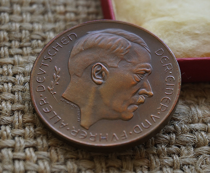 德奥合并(1938年3月13日)/侵占苏台德(1938年9月29日)铜币,直径3.5CM,版面由当时著名设计师Hanisch Concee设计,侧面边缘标记“Hauptmunzamt Wien”。原厂包装盒,正面烫金万字。非常稀罕。
