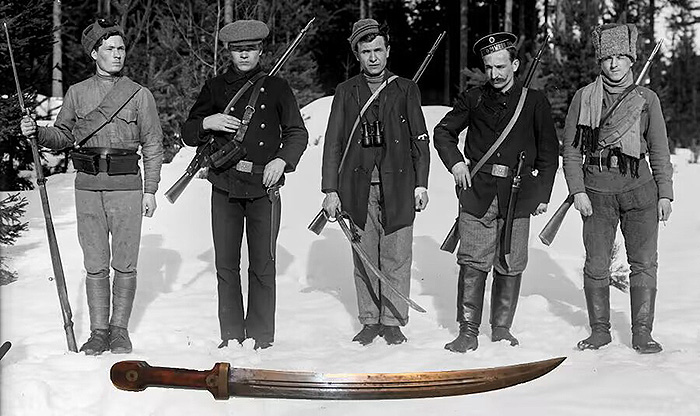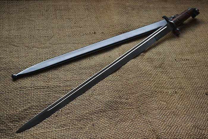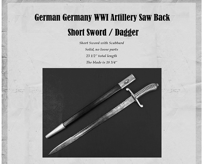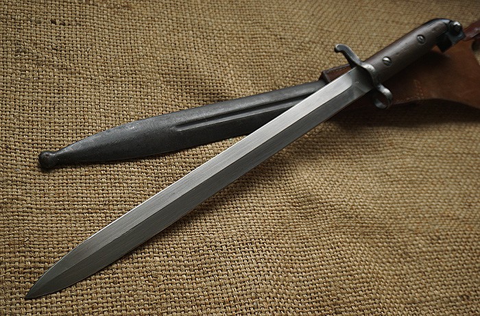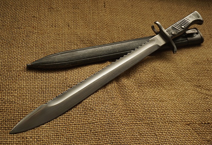 极其稀罕收藏品种,总长28CM,兼具近身防卫格斗与上木仓冲锋两用功能。一战中后期在军用原材料日益紧缺的情况下发行。该刀整体全品相,刀身轻微使用状态,刀鞘烤蓝完整,刀鞘上的皮绑带保存完美。