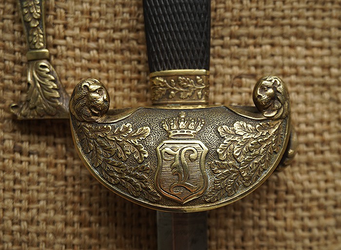 总长90CM,牛皮鞘,两端黄铜构件轻微小磕。护手正面德国皇冠图案,两侧灈狮头装饰,刻花刀身轻微锈污,整体接近全品相。