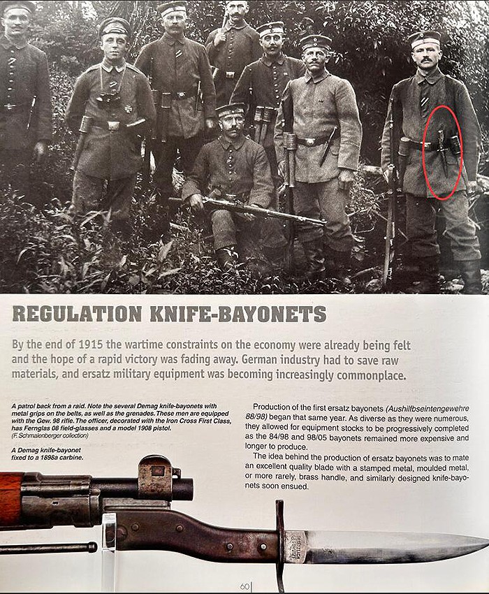 一战后期,为了装备供应能跟上前线消耗,德国人在98-05屠夫刺上作出了改良,增强了其使用寿命及简化压缩了生产过程,原两片式桃木柄+火焰片握把改为全铁柄,并增加了敞口式设计的木仓环,原铁鞘皮鞘因为英军的海上封锁变得原料短缺而采用铝制,代用屠夫发行时间非常短暂战争就结束了,今天能上手一把上好品相非常难得!