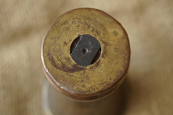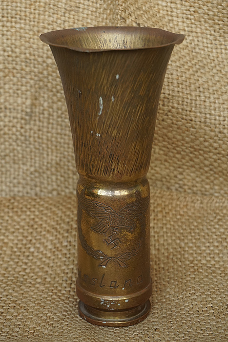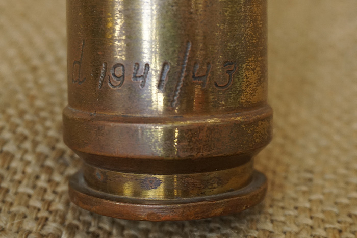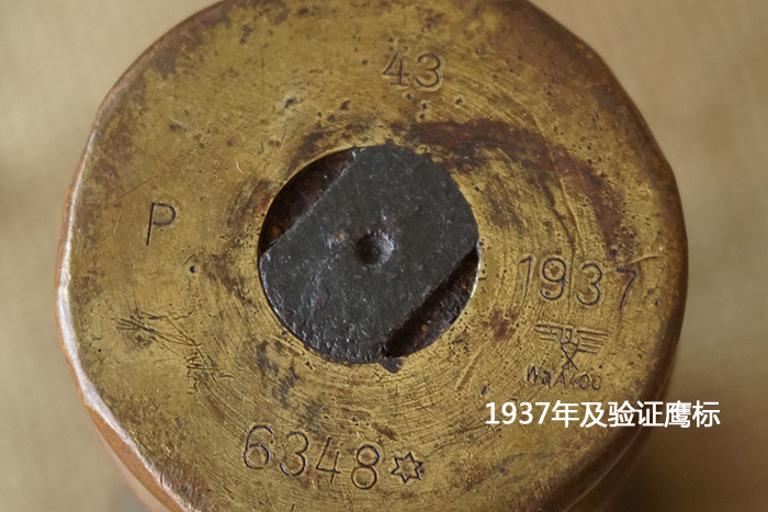 当年德国空军士兵手工雕刻的航炮蛋,瓶身有德文Russland(俄国),及年代41-43(德军进攻苏联最为激烈的三年),瓶底有1937年年份及验证鹰,具体尺寸:瓶口直径8.2CM,瓶底直径5.4CM,高17.5CM