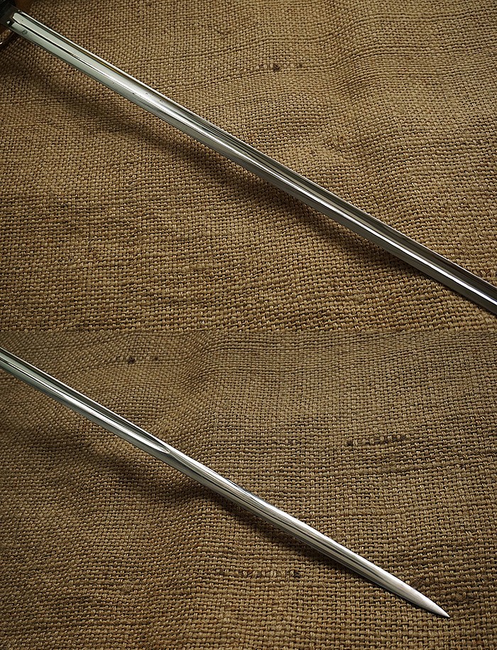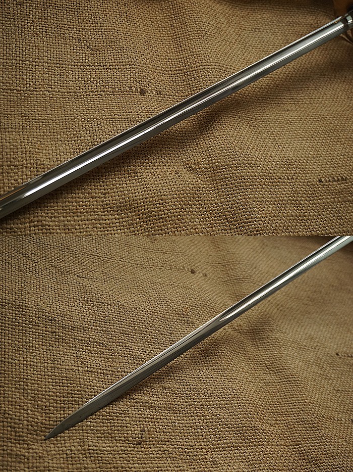总长107CM,狭长刀身极具贵族格斗风格,刀鞘末端附近轻微几点小磕,刀身轻微历史污渍,骨角手柄装镶宽大的黄铜护手。