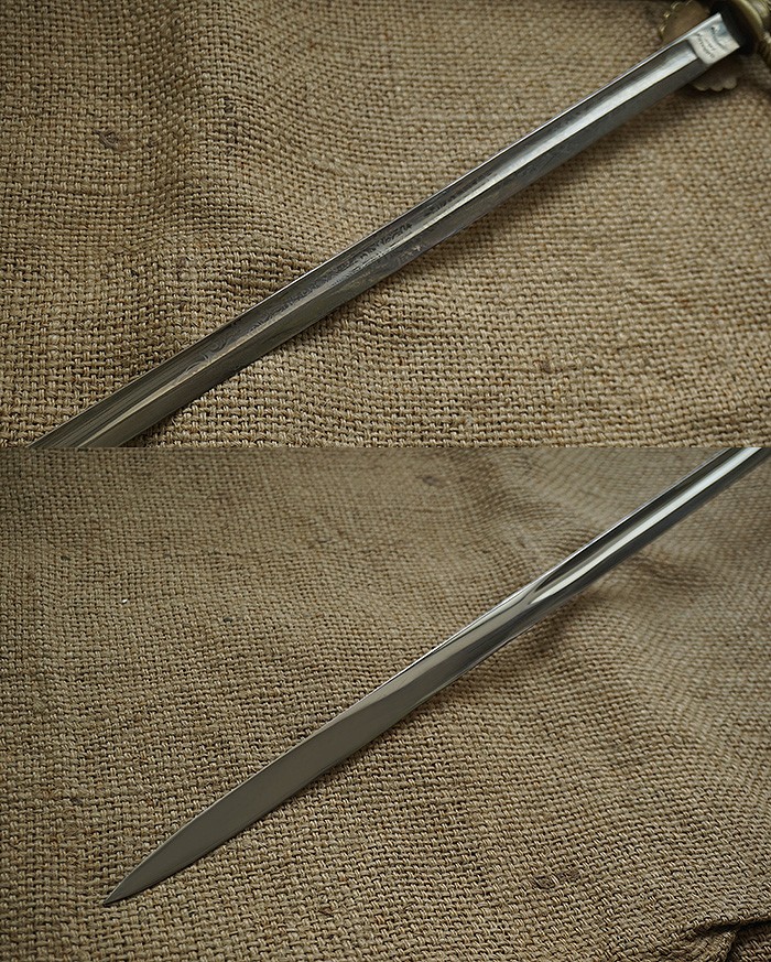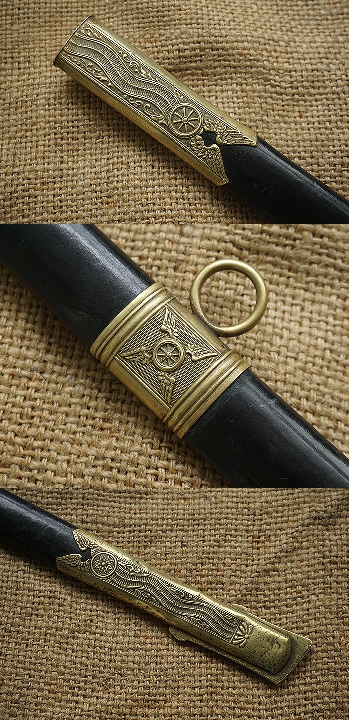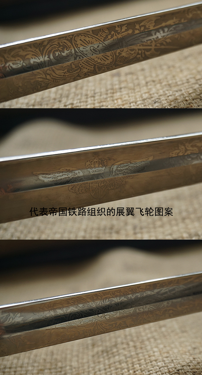 总长98CM,全品相刀身带刻花,手柄、护手及剑身上的装饰全部是黄铜材质。其中护手装饰带“双翼飞轮”标志,代表铁路为帝国提速,柄末圆形设计代表地球仪,寓意帝国铁路线未来将横跨贯穿世界各大洲。刀鞘上的构件装饰图案都是带轨道的“飞轮”标志,鞘身由皮革包裹铁鞘,末端黄铜构件少许磕碰,整体手感非常沉重。