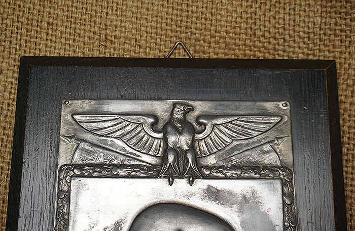 尺寸:18.6X25.6CM,原品木板底托浮雕式铝合金国防军士兵像,最高处配以帝国鹰作为装饰,底部德文大意:德国 荣誉与防御。