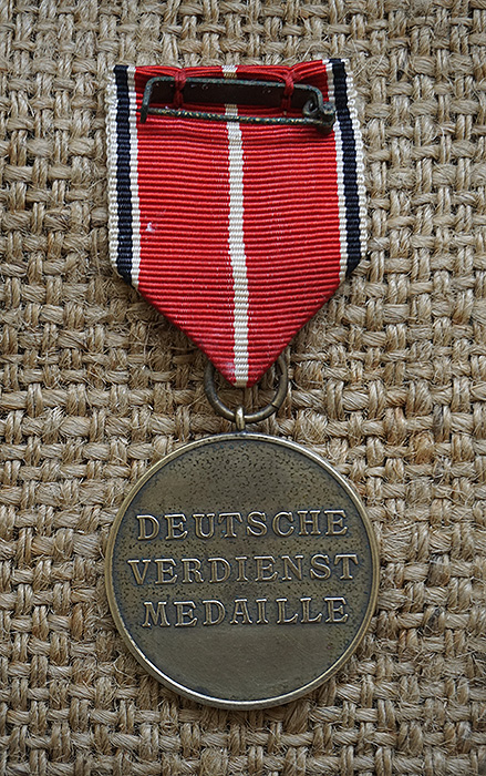 当年由纳粹政府颁发的一项外交荣誉奖,主要授予对象是为德国作出杰出贡献的外国人,特别是外交人员。该章铜质,挂环上标记30,即由奥地利维也纳厂生产。背面德文Deutsche Verdienst- Medaille,大意为功勋奖章。