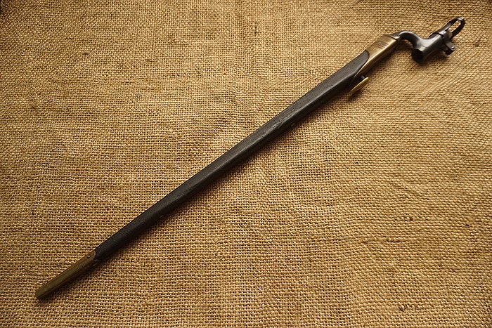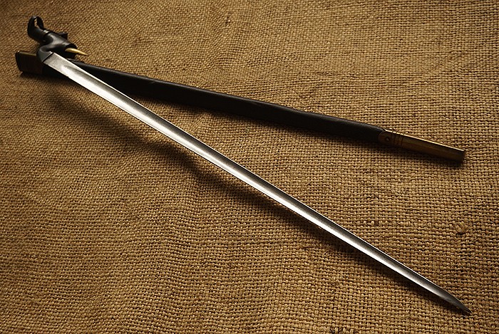 皮鞘无老化破损,前后端由铜构件包裹,三棱白磨刀身轻微历史污渍。