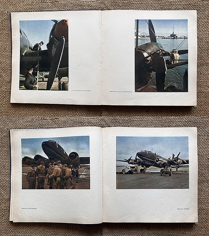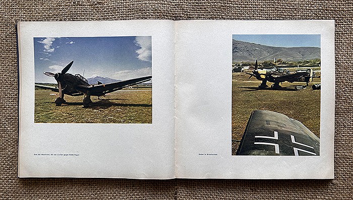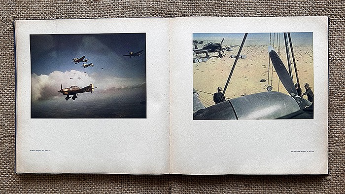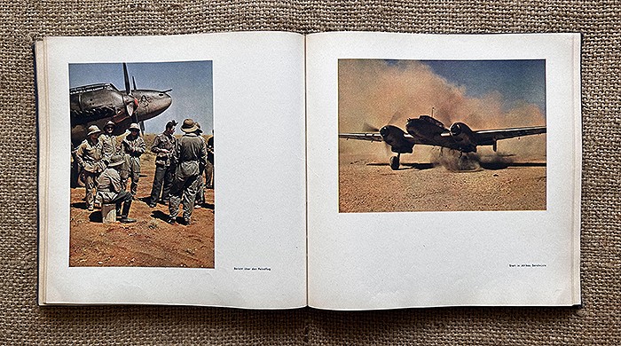 尺寸:24X24CM,1942年发行,麻布质硬抄封面,侧面有德文:Fliegende Front(即:飞行前线),共120页,内容涵盖北非战场、东线战场、西线战场、援助海军、高炮部队、空降部队等,共108张相片,全部罕见地采用彩色印刷,难得一遇的战场实况图鉴。