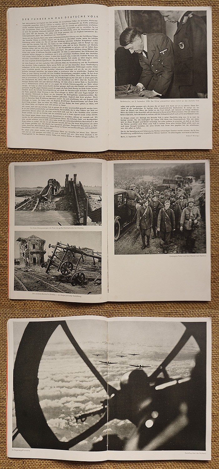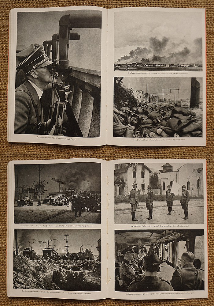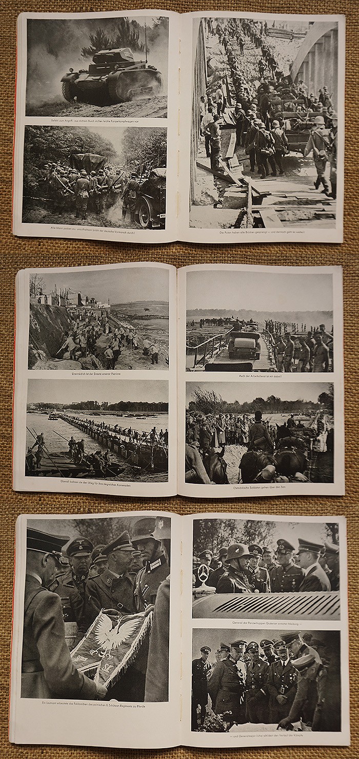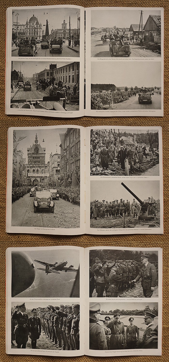尺寸:19.5X26.3厘米,全书100张黑白照片,92页。图片内容论述了德国在入侵波兰前会议商讨计划并最终由元首签名下达入侵命令于1939年9月1日凌晨四点四十分正式行动,空军率先发起猛烈攻击,陆军势如破竹深入波兰腹地,元首亲赴前线指挥所听取战况汇报等等珍贵画面都被霍夫曼及时记录下来。