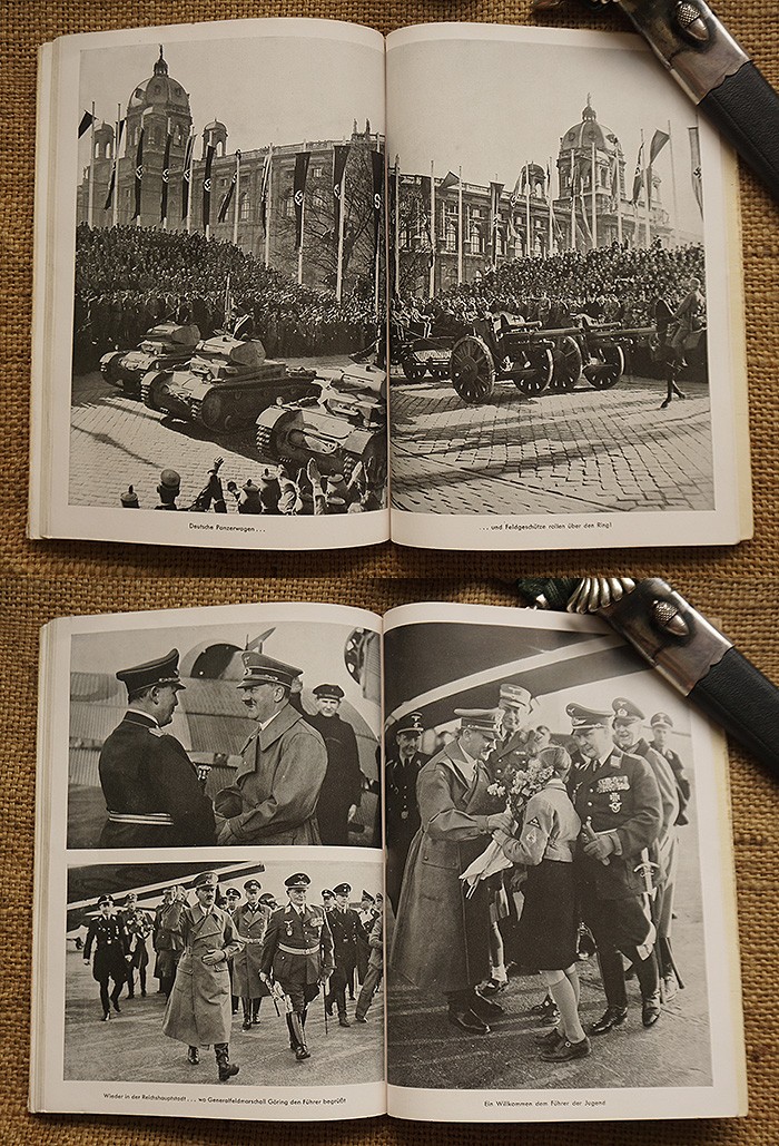 尺寸:19.3X26.5CM,全书78张黑白照片,62页。图片内容讲述了1938年3月13日德国与奥地利合的重要历史事件,霍夫曼从不同的角度去包装宣传元首在奥地利人民心目中的“神圣地位”和受到狂热追捧,从主动开启边界护栏迎接德军,到万人空巷夹道欢迎元首车队,再到3月15日20万人聚集在维也纳的英雄广场聆听元首宣布德奥合并,每一张相片都代表着元首的高光时刻。