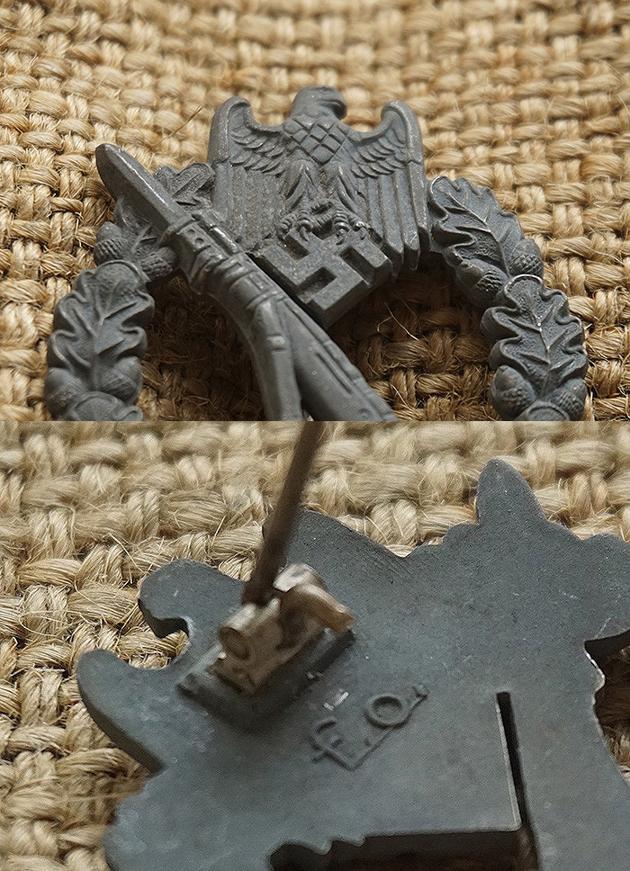 锌合金材质,库存品相没有使用过。授予参加过三次步兵突击战或反击战、侦察行动步兵人员。