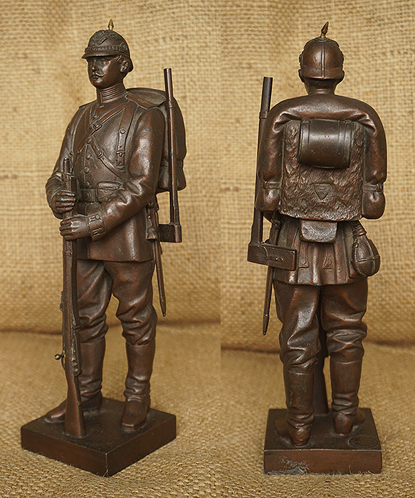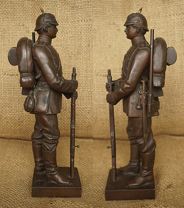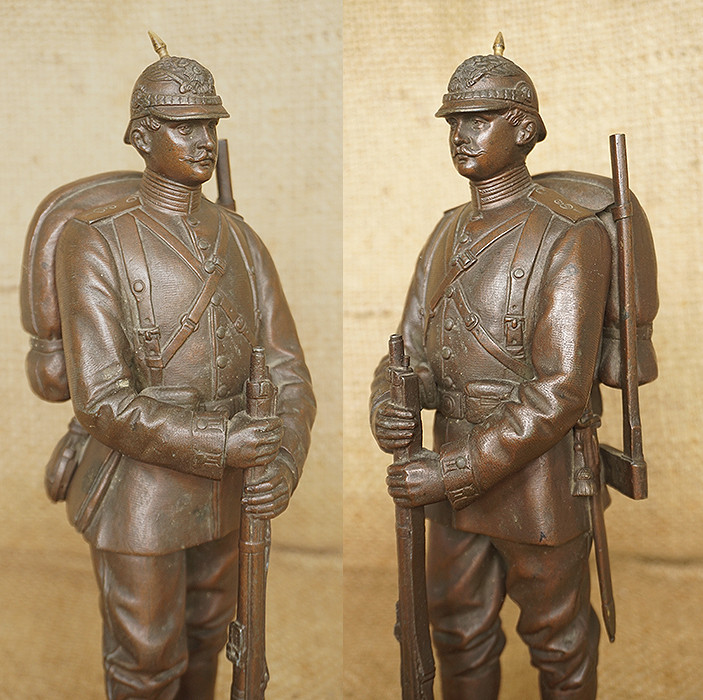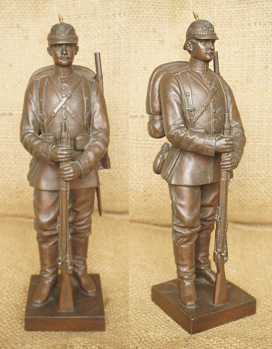 极其少见,高约28厘米,全铜打造,重达1735克,脚部位置带柏林厂标。整体全品相,细节极尽丰满,腰间1871刺,肩章军衔,头盔正面的帝国鹰都完美铸造出来,唯一美中不足的是头盔顶尖少许歪偏。