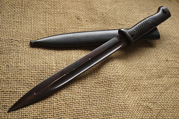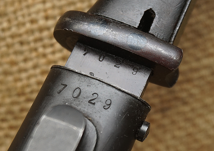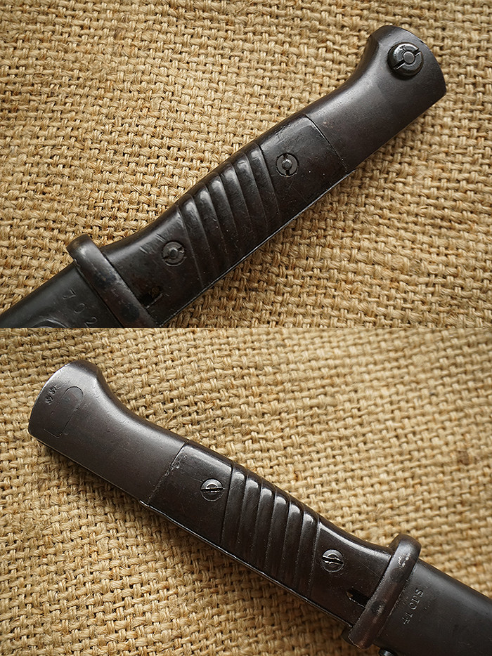 刀身38年烤红版本,无刃伤,轻微进出鞘夹片痕迹。41年刀鞘烤蓝完整。