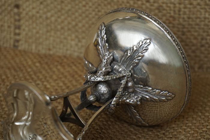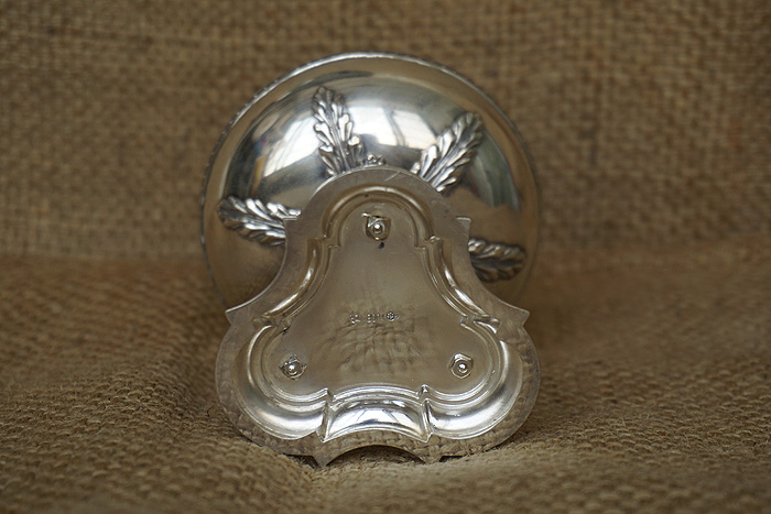高9.5CM,直径8.5CM。月亮+皇冠标,800银,重133克。高脚造型,底部为狮爪设计,以橡叶为托,做工精细,观赏性更甚于实用性。