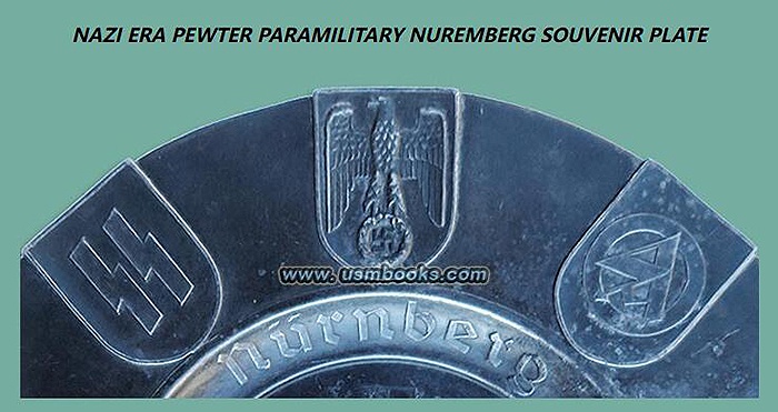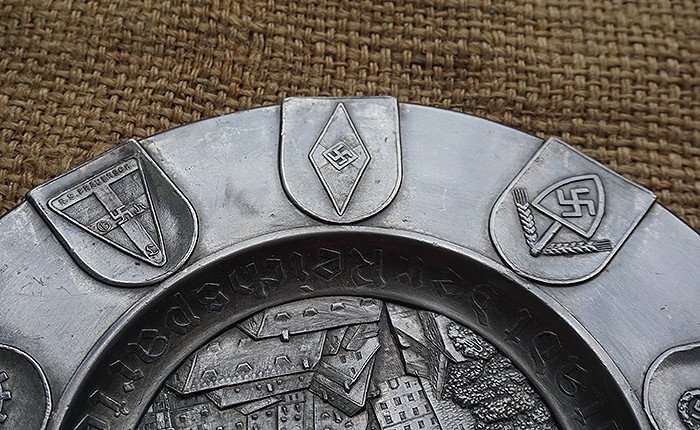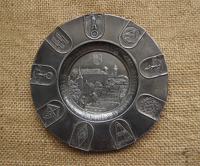 锡质,直径20CM,中间主体图案是纽伦堡城市风景,各准军事部门徽标环绕一圈,整体包浆柔润无破损。