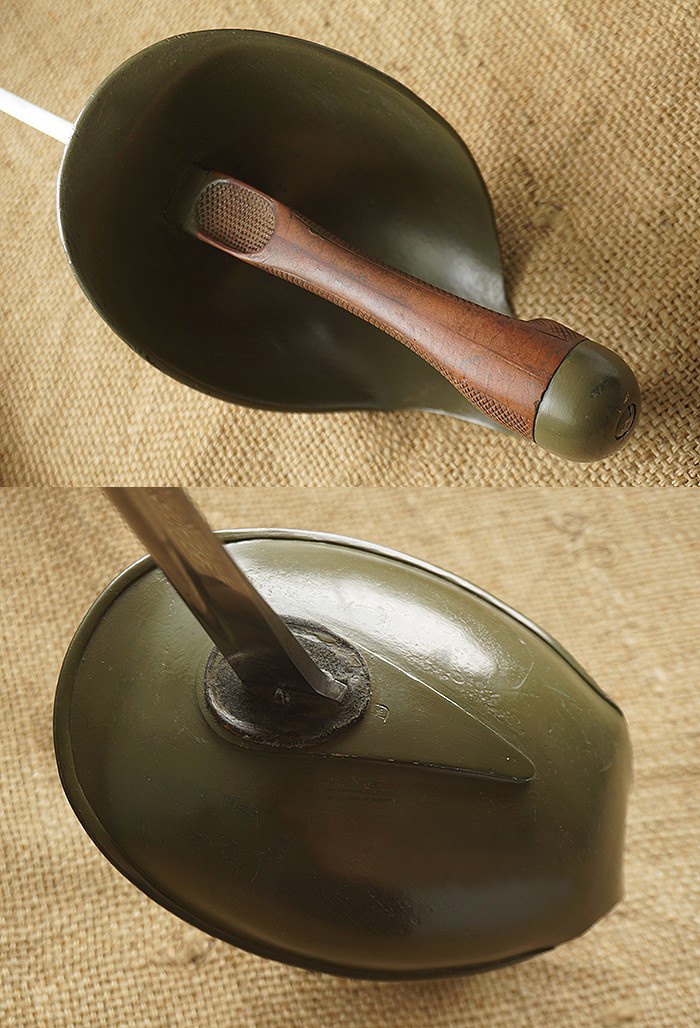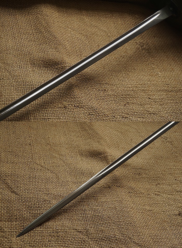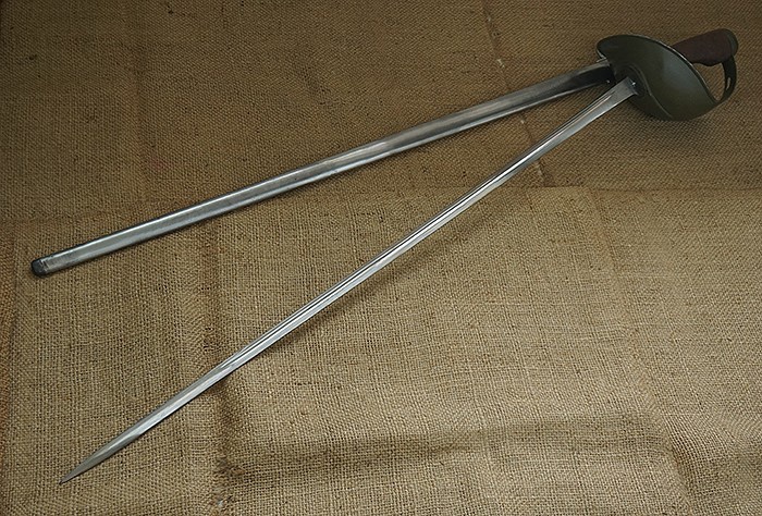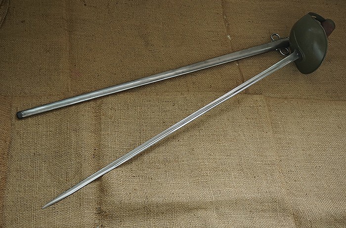 一把极具骑士风范的重骑兵,也是英军部队最后一款制式骑兵军,设计专为重骑兵使用,特别强调刺击功能。 该刀总长113CM,宽大包裹形护手刷大绿漆,接近全品刀身轻微锈污。镀镍刀鞘无明显磕碰,遗留少许历史锈污。