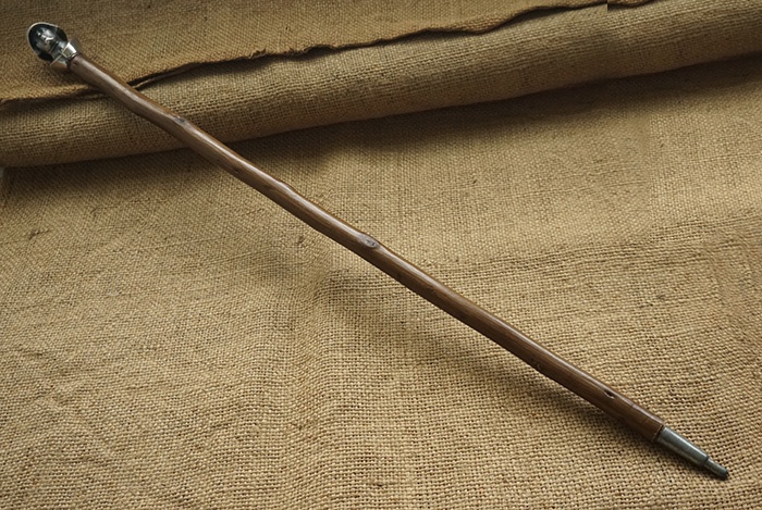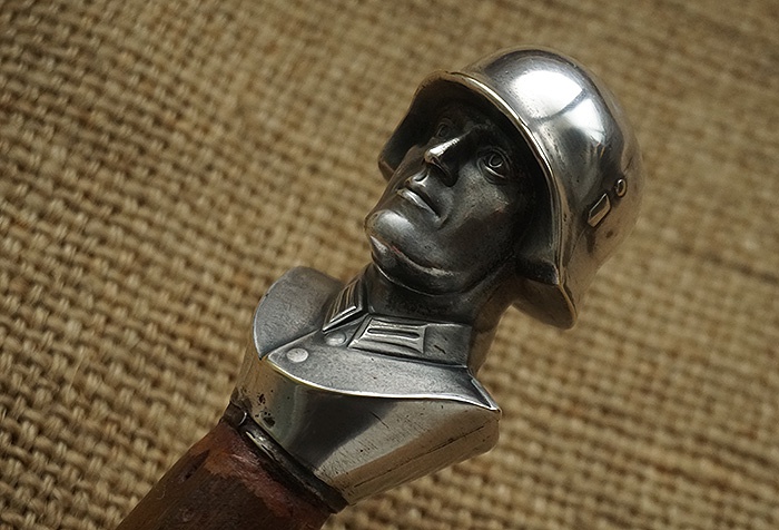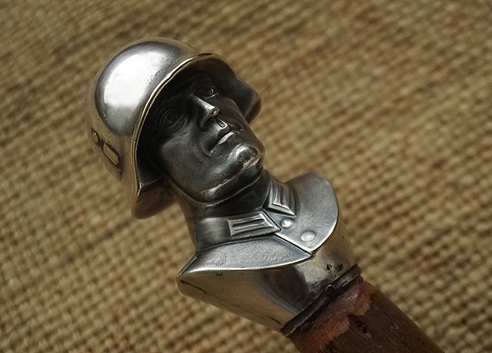 主体是木棍,总长接近84CM,头部镶嵌铜质镀镍国防军半身像,头盔位置轻微小磕碰。底部套铁质拄头。