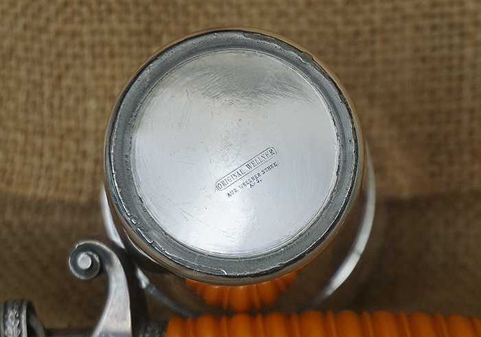 镍银合金材质,直径9CM,高约13CM,重量366.7克,正中位置德国万字,环绕杯身的德文“JUBILÄUMSGABE DER KAMERADSCHAFTLICHEN VEREINIGUNG”,即:战友联合会的纪念杯。杯身保存非常洁净,表面没有磕碰,稍作清洗还能使用。