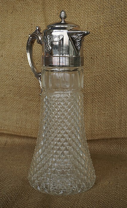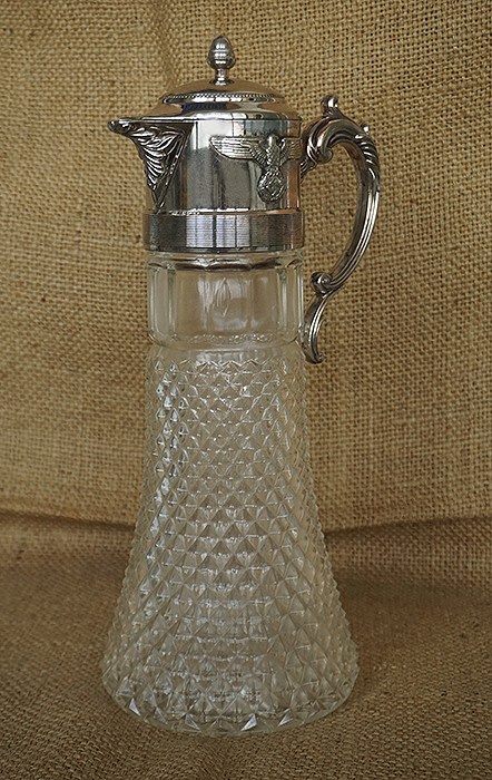 总高36CM,壶底直径14CM,壶帽是白铜合金镀银材质,两侧镶党鹰。壶身是水晶玻璃打造,无任何破损。该壶属二战德国高层党部酒店专用,极其硕大豪华。稍作清洁还能继续使用。
