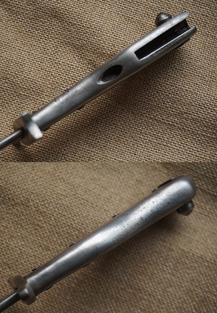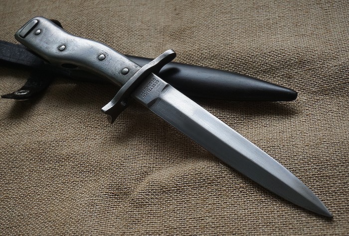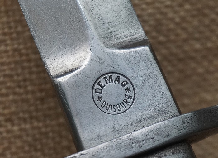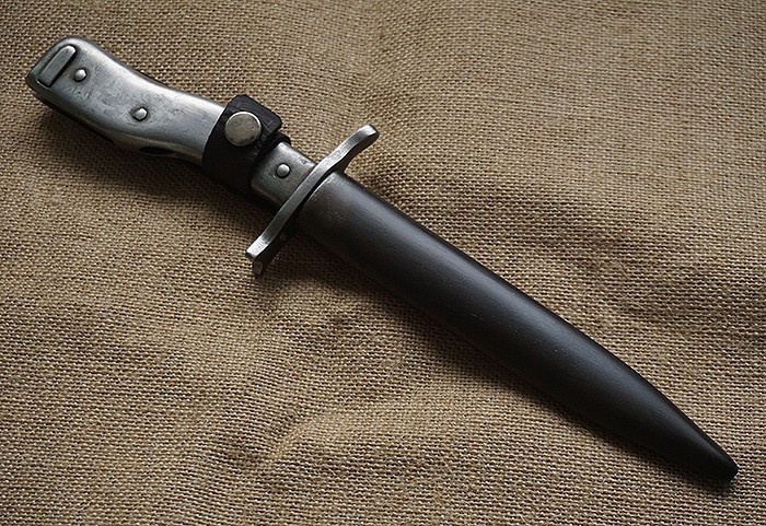 极其稀罕收藏品种,总长28CM,兼具近身防卫格斗与上木仓冲锋两用功能。一战中后期在军用原材料日益紧缺的情况下发行。该刀整体全品相,刀身轻微使用状态,刀鞘烤蓝完整,刀鞘上的皮绑带保存完美。