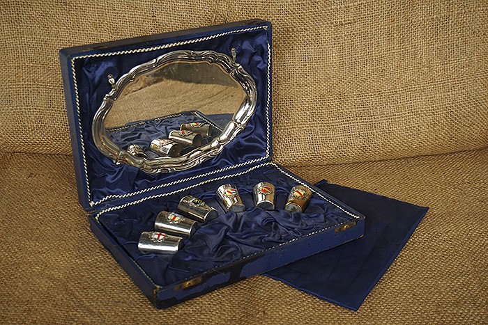 原木盒外包裹皮革,尺寸:27 X 19.5 X 5.7CM,一共六只杜松子酒杯与一个托盘,酒杯尺寸:直径3X高度4.5CM,托盘尺寸:23X16CM,全部铜镀银材质,每只杯子的正面均镶有其所属的地区的珐琅釉盾章,并标记该地区的名称:Lahr(拉尔)、Freiburg i.B.(弗赖堡)、 Baden-Baden (巴登地区)、Karlsruhe(卡尔斯鲁厄)、Pforzheim(普福尔茨海姆)、Heidelberg(海德堡)。原盒正面镶有帝国体育联合会徽。