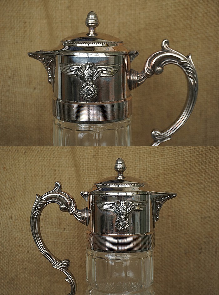 总高36CM,壶底直径14CM,壶帽是白铜合金镀银材质,两侧镶党鹰。壶身是水晶玻璃打造,无任何破损。该壶属二战德国高层党部酒店专用,极其硕大豪华。稍作清洁还能继续使用。