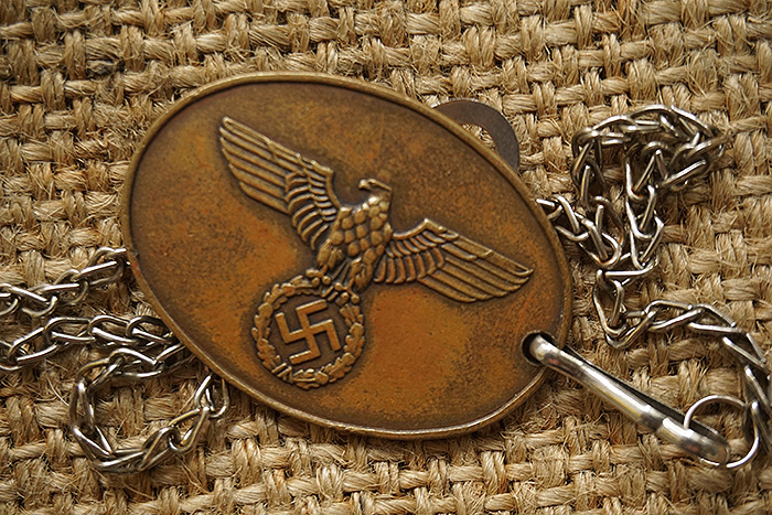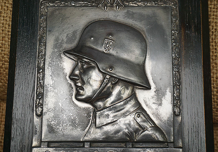 尺寸:18.6X25.6CM,原品木板底托浮雕式铝合金国防军士兵像,最高处配以帝国鹰作为装饰,底部德文大意:德国 荣誉与防御。