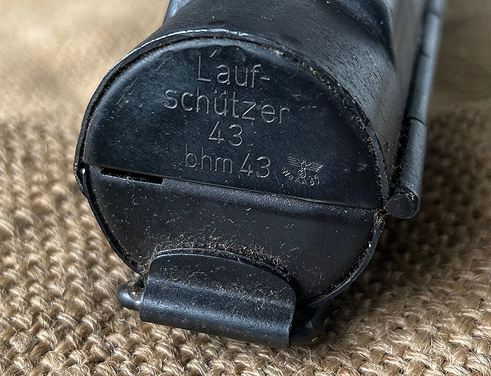 1943年老库存,没有使用过,属于当年盟军从仓库缴获的战利品。尺寸:长65CM,直径5CM,中间开合,整体呈圆柱形设计,通体烤蓝防锈工艺,侧面保留原厂帆布挂带,底部带厂标、年份及纳粹验证鹰标。